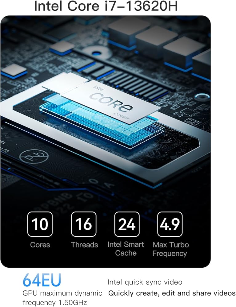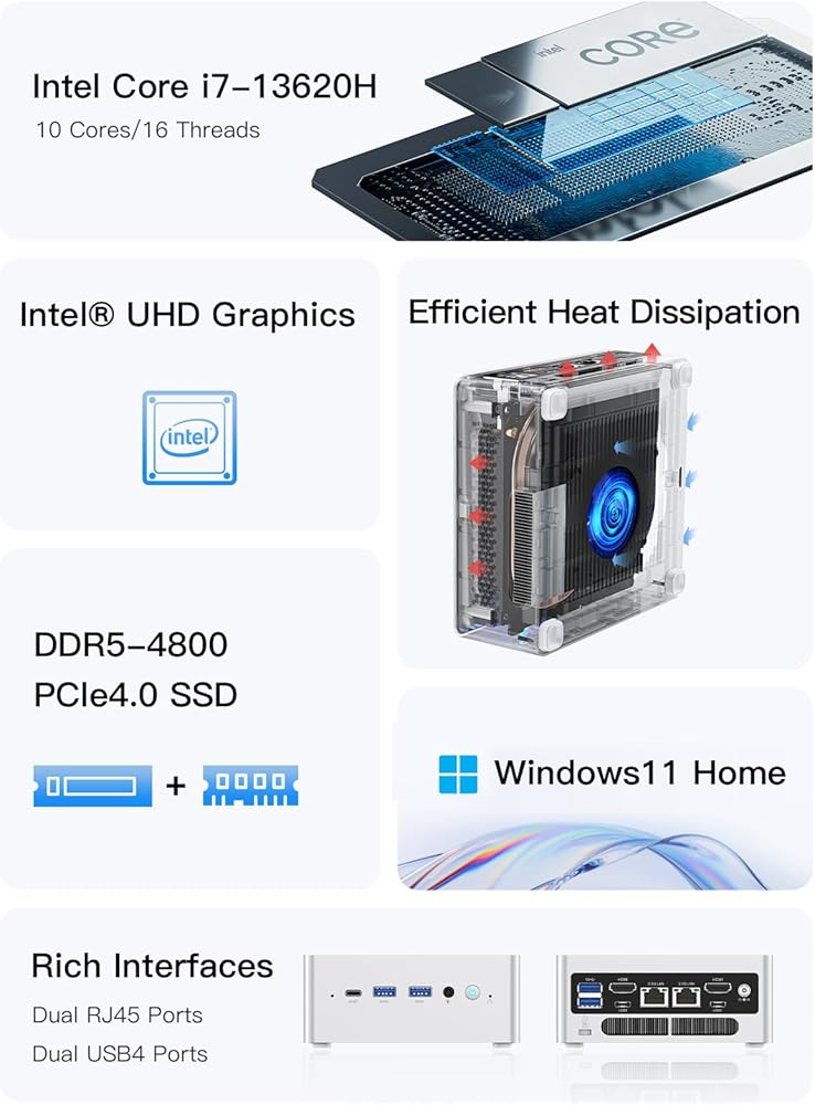 【معالج Intel Core I7 13620H القوي】 Minisforum NPB6 Mini PC ، مدعوم من معالج Intel Core I7 13620H الثالث عشر ، 10 مرأى/16 مؤشرات ترابط ، (ذاكرة التخزين المؤقت 24 ميجابايت ، وتردد حتى 4.9 جيجا هرتز). يعمل بشكل أسرع ويحسن جودة الألعاب والتطبيقات الأخرى. قم ببث مقاطع الفيديو ، والمهام المتعددة ، والاستماع إلى الموسيقى ، والمزيد أثناء الاستمتاع بالأداء العالي أثناء التنقل أو في العمل أو في اللعب.