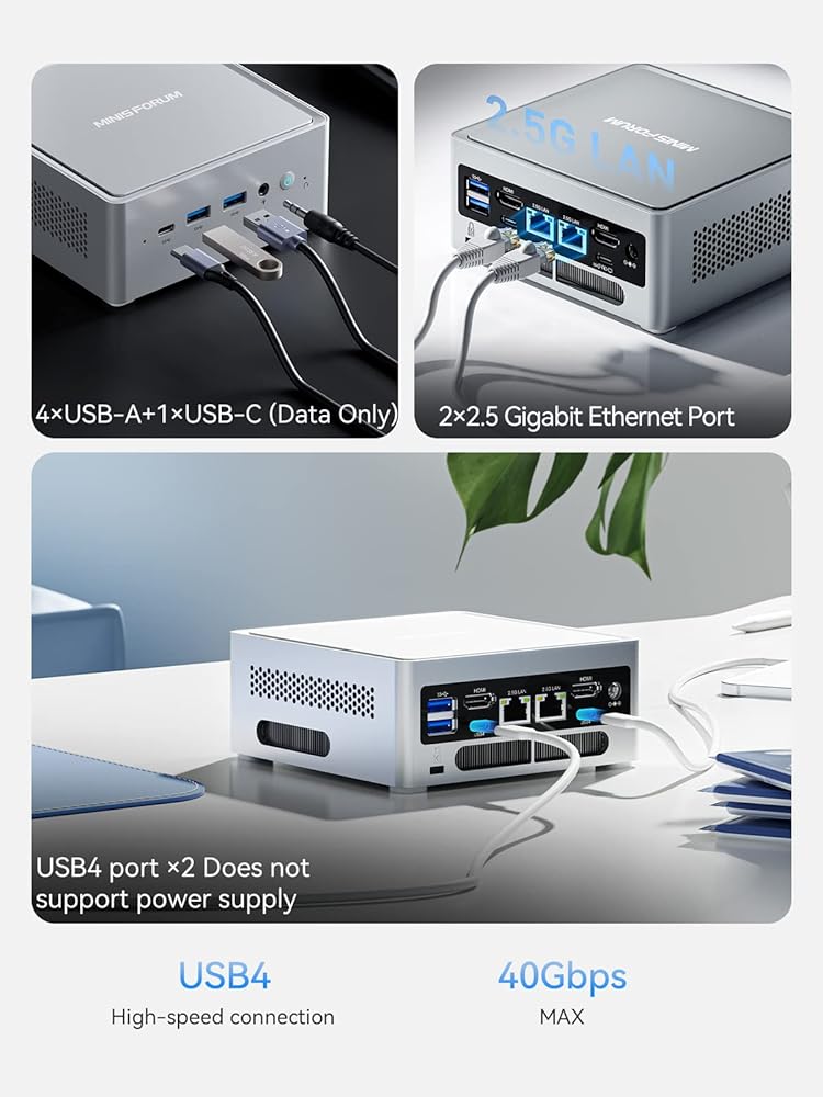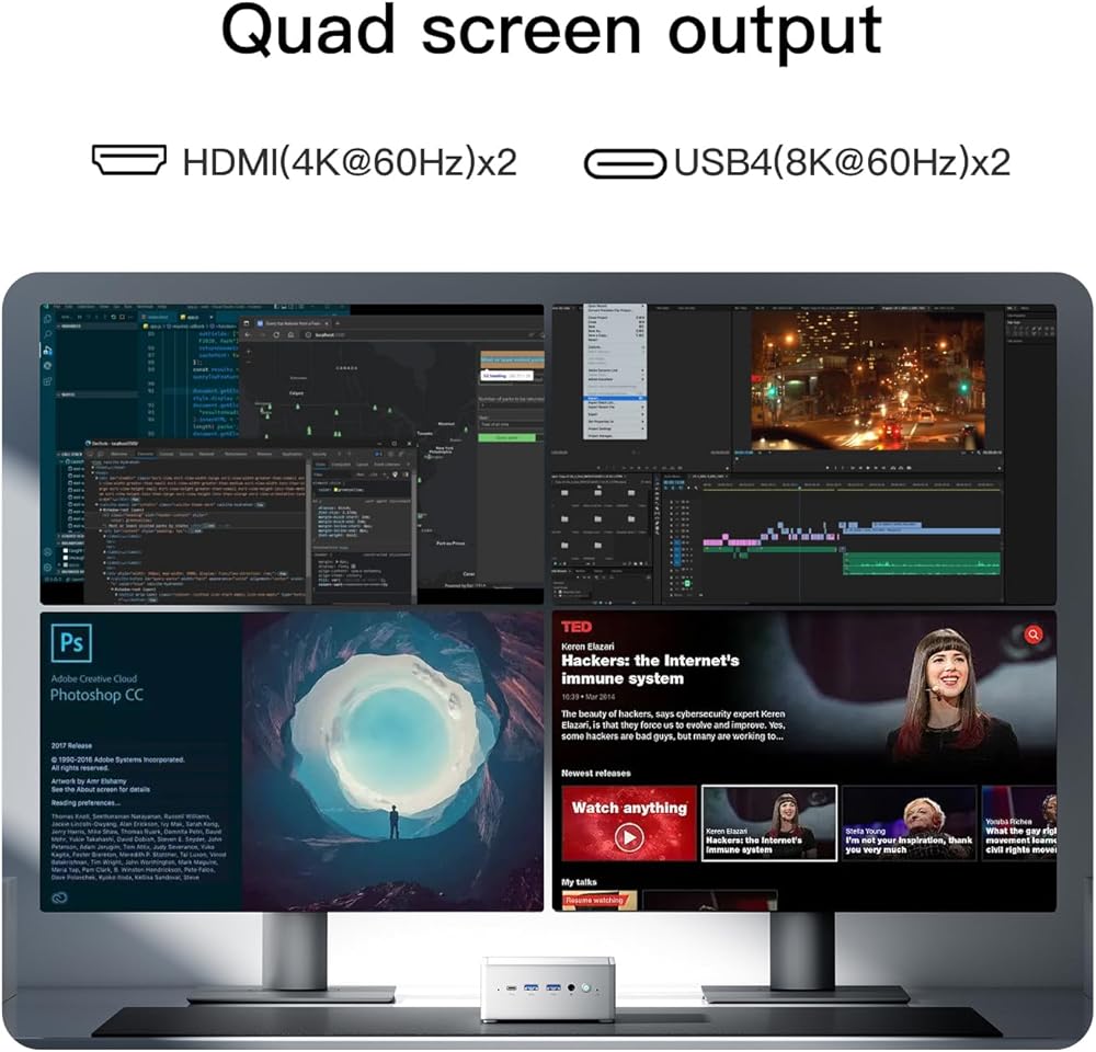【مخرجات الفيديو الرباعية】 NPB6 تحتوي أيضًا على منافذ إخراج متعددة ، بما في ذلك اثنين من HDMI واثنين من USB4 عالي السرعة. لا يدعم HDMI الدقة 4K@60Hz ، ولكن USB4 يدعم أيضًا 8K@60Hz. في هذه الحالة ، يمكن أن يمنحك العمل على شاشات متعددة في نفس الوقت تجربة إبداعية استثنائية وزيادة كفاءتك. مناسبة بشكل خاص للألعاب ، العمل ، الترفيه ، التحرير ثلاثي الأبعاد ، إلخ.