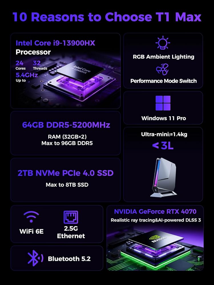 كمبيوتر ألعاب صغير TOPGRO T1-MAX، الجيل الثالث عشر i9-13900HX، Geforce RTX4070 8G GDDR6، 32 جيجابايت DDR5، 1 تيرابايت PCIe4.0 SSD، كمبيوتر AI للألعاب، إضاءة RGB، HDMI2.0/DP2.0/WiFi 6E/BT 5.3/Win11 Pro كمبيوتر مكتبي عالي الأداء