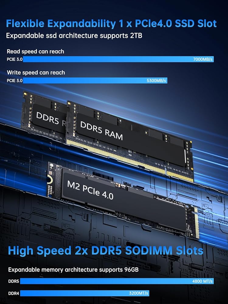 [RAM & SSD] تم تجهيز جهاز الكمبيوتر الشخصي I9 Mini مع بنية RAM مزدوجة القناة DDR5 مع فتحات 2 × SODIMM ، ويدعم سرعات تصل إلى 4800MT/S الحد الأقصى لسعة 96 جيجابايت ، وتتضمن 1 X M. HDDs ، كل قابلة للتوسيع إلى 4 تيرابايت. تتيح ذاكرة Thdeukoty MV9-LARGE تعدد المهام السلس ، وأداء سلس وفعال دون تأخير.