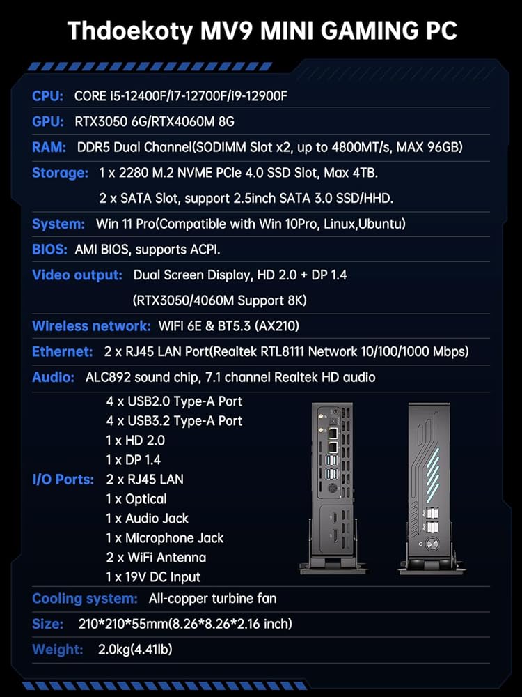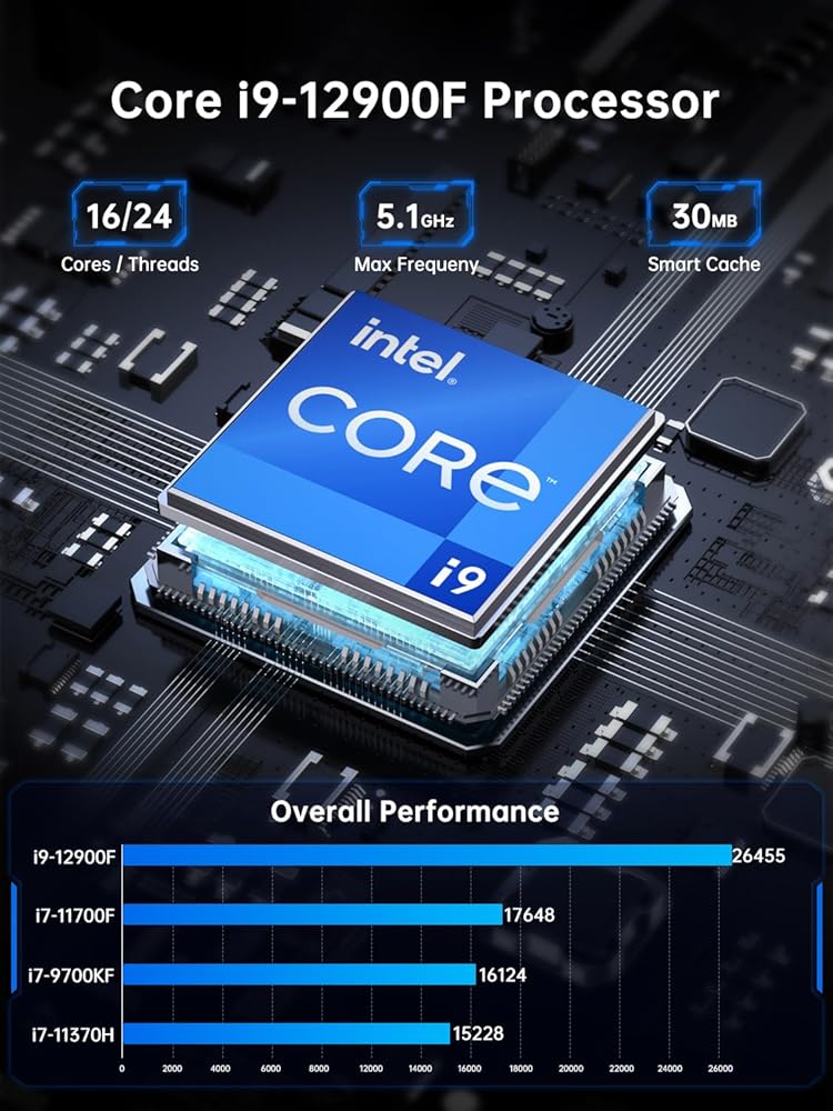 [أداء قوي] تم تجهيز Thdeukoty MV9 Mini PC بمعالج Core I9-12900F ، 8 نوى/16 مؤشرات ترابط ، ذاكرة التخزين المؤقت الذكية 16 ميجابايت وتردد تصل إلى 5.1 جيجا هرتز ، مثل الوقت الذي تعمل به نفس الوقت من قبل 4K Content Confervics.