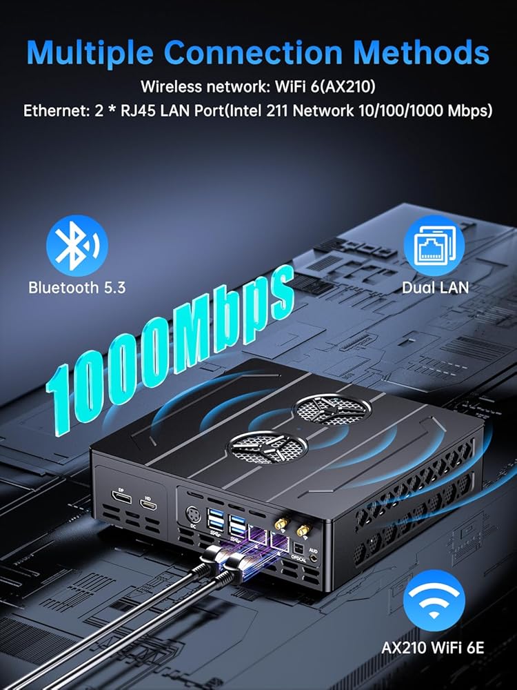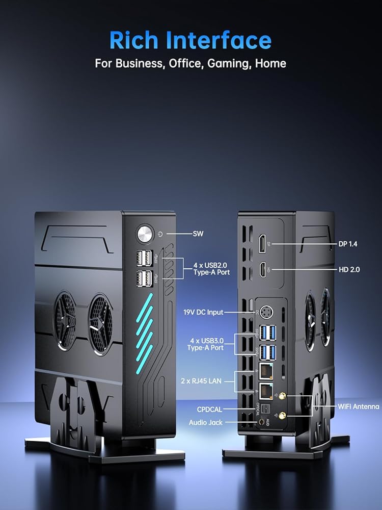 [واجهات غنية] تم تجهيز الكمبيوتر المصغر بزر طاقة 1 X ، إدخال 1 × 19V DC ، 4 × منفذ USB 2.0 Type-A ، 4 × USB 3.2 منافذ Type-A ، 2x RJ45 LAN ، 2 x wifi هوائي ، 1 x بصري. كما أنه يحتوي على بطاقة شبكة Intel AX210 مدمجة ، ويدعم WiFi6e و Bluetooth 5.3 ، ويجعل مساحة سطح المكتب أكثر من خلال الاتصال اللاسلكي.