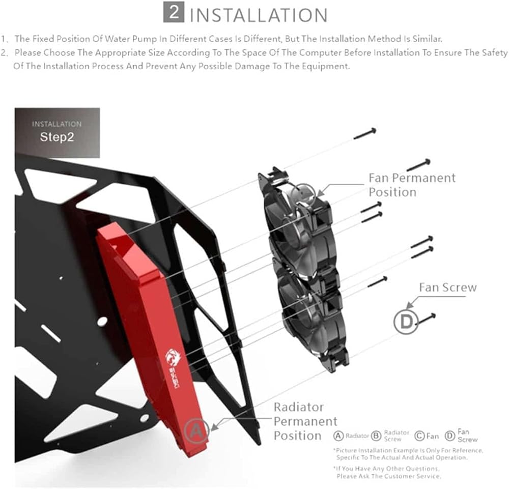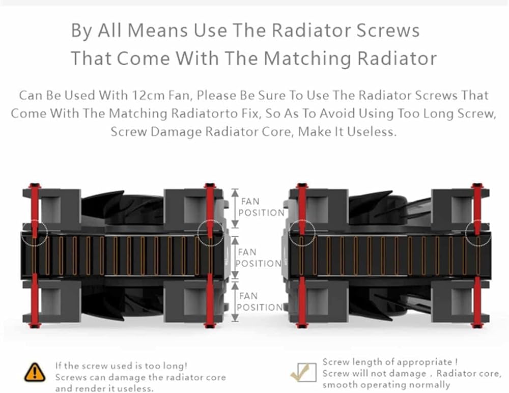 Please pay attention to the length of the screw. If the screw is too long, it will break through the radiator and cause water leakage, voiding warranty. Radiator comes with M3X30mm screws suitable for fans of 25mm thickness. If you want to install a thinner or thicker fan, please use the right length of the screw. (Fan thickness+5mm)