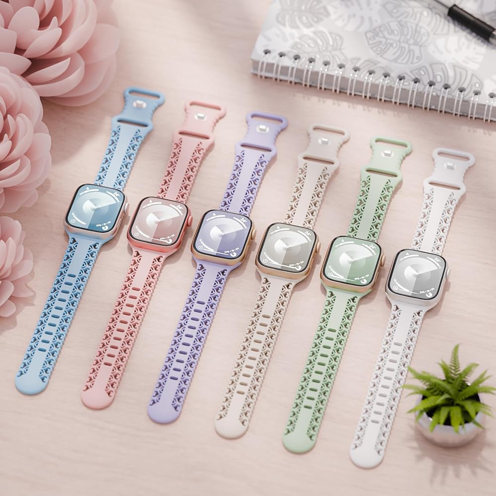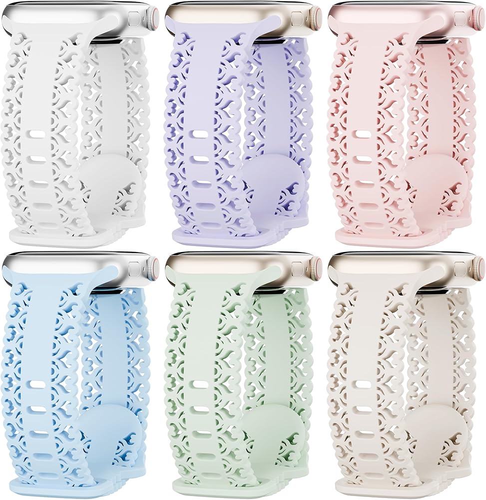 TSAAGAN 6 pack lace hollow-out silicone sport band compatible with apple watch bands 42mm(Series 10)/46mm 41mm/45mm 40mm/44mm 38mm/42mm 49mm, our iWatch bands for women is made of durable and high quality soft silicone material.