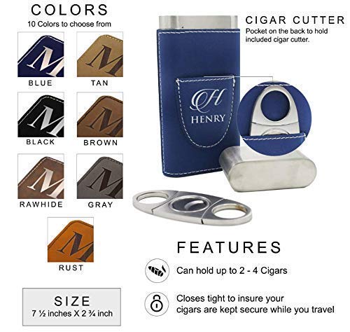 Engraving Options! Lid Only or Front Pocket Only or Back Only or a combination. See Color Selection Box QUALITY - Measures 7.5"x 2.75" and holds 2-4 cigars depending on the size. GREAT GIFT - Perfect gift idea for a the cigar lover in your life! Perfect for Golf, Poker, Travel, Weddings, Bachelor Parties and more! Add Each to Cart Separately so you can Customize Each One Indivually Custom Images or Logos also Possible. Please email prior to purchase. Custom Laser Engraved on these Great Cigar Cases. The recipiant can carry their cigars in style with this great carrying case that comes with a cutter as well. Always be ready to light up and celebrate on the golf course, poker room or any party. Perfect for groomsmen, best men and the whole wedding party. Great Monogram and Font styles and multiple colors for any person's taste. Case measures 7.5" x 2.75" and can hold from 2-4 cigars depending on the size. You may engrave in One Location or Two or ALL Three (Lid, Pocket,Back) We Laser Engrave the Leather or Stainless Lids which is peranent and will not wear off. If you select for Lid Engraving, the engraving will be Black.