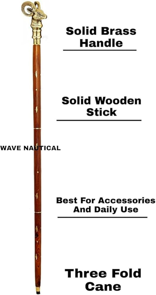 this is foldable solid brass and wood handle Wooden Walking Stick cane and very easy to carry the people love this cane and very easy to use this walking stick is help a person to get a support to stand properly but not only for old people also made for give a unique look for any occasion like helloween costume-christmas day-larp nautical and antique collector also collect this type of replica walking stick increase your personality and you a gook look to you walking canes also for decoration as a use decoration, gifting purpose, self use, grandfather's gift, anniversary gift or birthday gift etc. Wooden shaft dismantles in to THREE section. wood Handcrafted Total length : 36 inches. Approx.