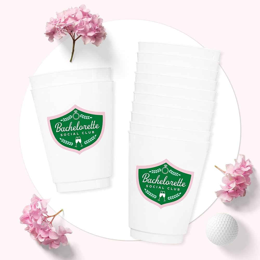 Celebrate the bride-to-be at her bachelorette party in boozy style with these bright and classy "Bachelorette Social Club" bachelorette cups – perfect for your bachelorette party drinkware! These originally-designed and trending flexible plastic cups include 12 reusable or disposable cups. Made in USA and hold 16 oz each. Personalized party cups for an unforgettable bachelorette trip, these washable cups can be used for wedding favors, party packs, bridal shower gifts, bridal shower games and bridal party cups. These cups pair perfectly with all sorts of themes including Country Club, Pickleball, Golf, Tennis, Last Swing Before The Ring, Bikinis & Martinis and The Perfect Match. Exclusive Stag & Hen design - you won't find these anywhere else, babes!
