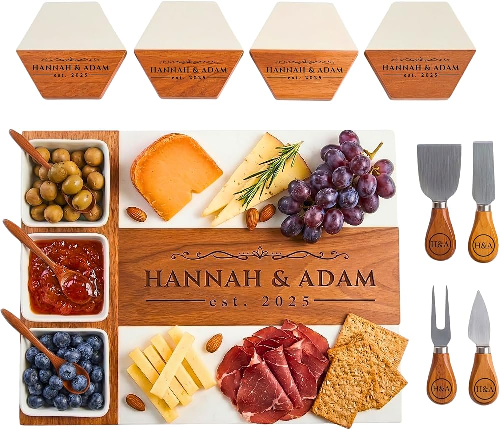 هدية مخصصة لكل مناسبة: احتفل بحظات خاصة مع مجموعة لوحة charcuterie القابلة للتخصيص. مثالية لحفلات الزفاف ، والاحتفالات السنوية ، وأعياد الميلاد ، و Housewarmings ، وعيد الحب ، هذه الهدايا المحفورة للأزواج والنساء تضيف لمسة قلبية لأي احتفال.