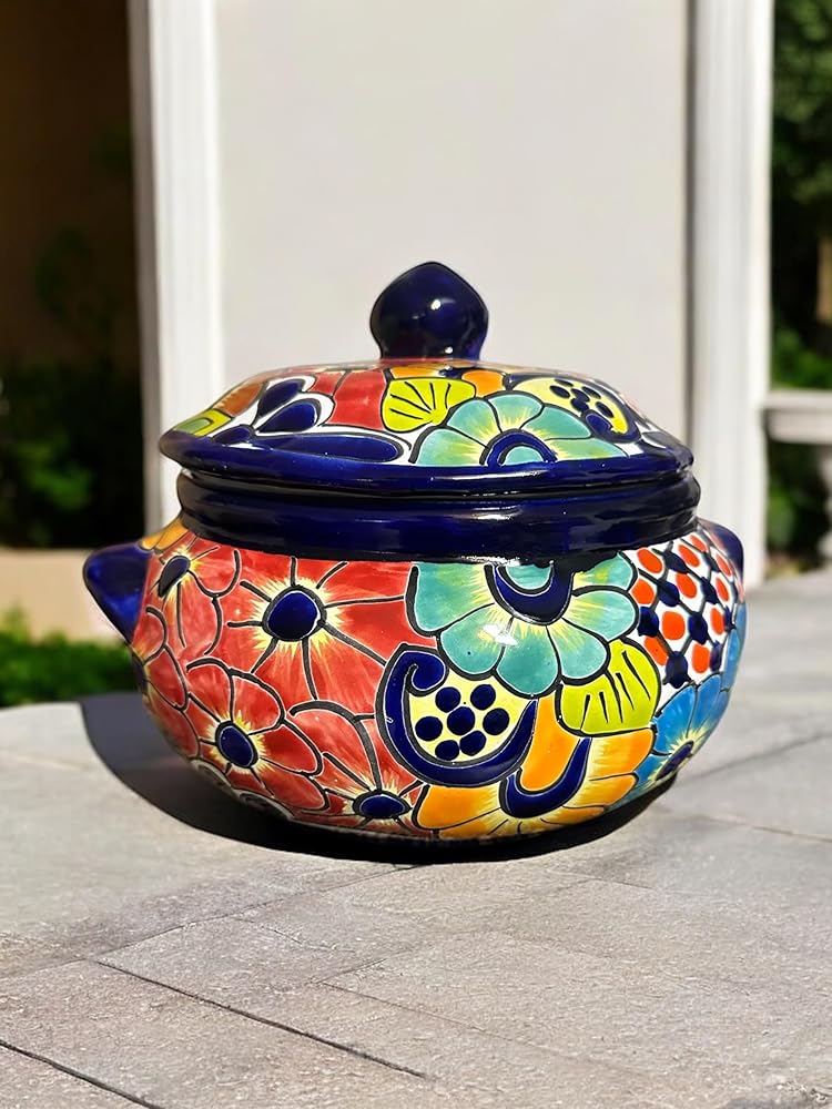 This handmade Talavera bean pot is a beautiful and functional addition to any kitchen. Crafted in Mexico, this traditional ceramic pot features two sturdy side handles and a fitted lid, making it perfect for serving, storing, and cooking meals. This stovetop-safe pot is ideal for preparing soups, stews, beans, and more. With a capacity perfect for a family of four, it can also be used as a decorative serving bowl for mashed potatoes, rice, or any dish you want to present in authentic Mexican style. Each pot is hand-painted with vibrant Talavera designs, making every piece unique and full of character. Whether you're using it for daily meals, special occasions, or as a statement decor piece, this Mexican pottery bean pot is a must-have for lovers of artisanal, handcrafted kitchenware.