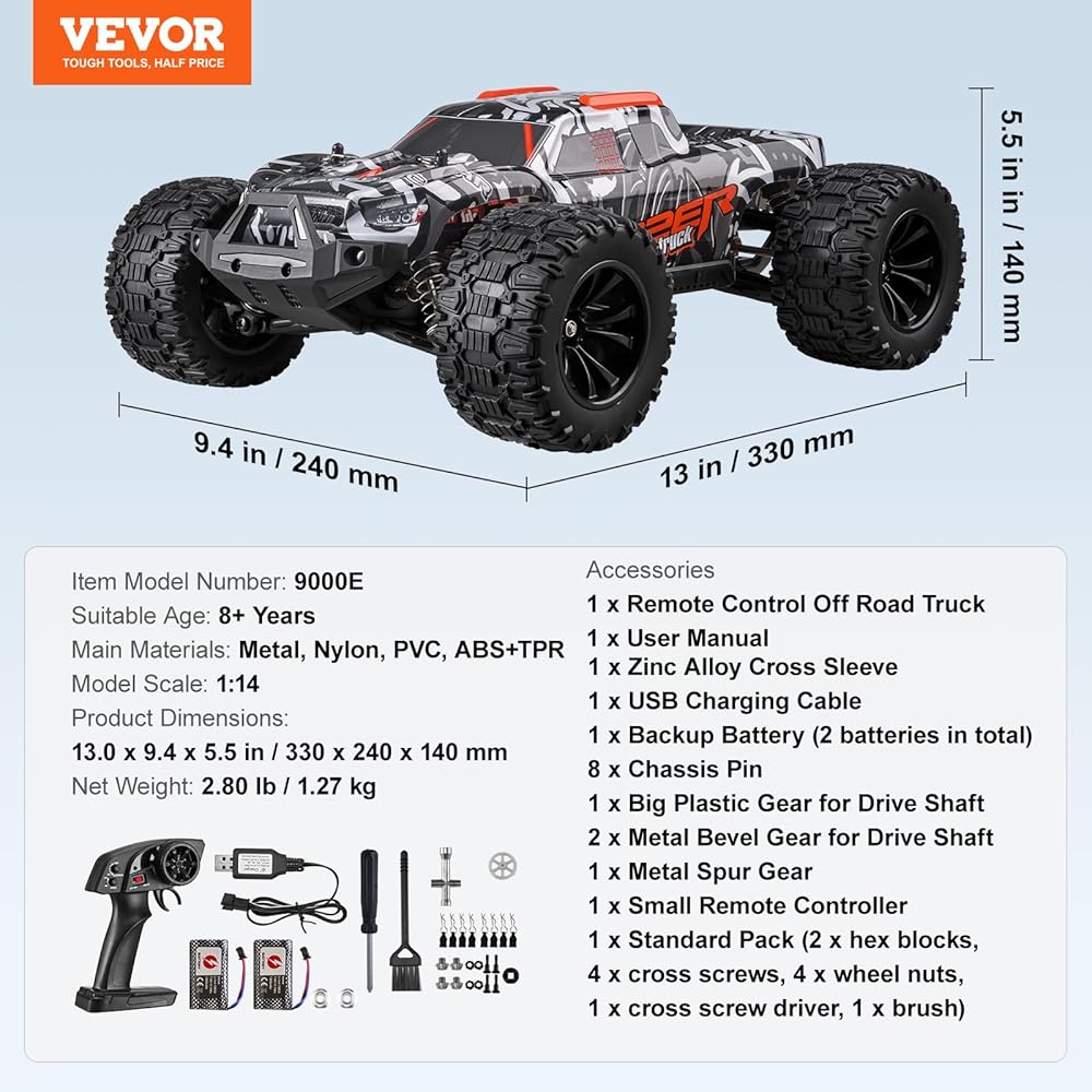 بطارية 350 مللي أمبير في الساعة قابلة لإعادة الشحن: تتميز بطاريتين ليثيوم 350 مللي أمبير في الساعة ، وتوفر شاحنة Vevor RC في جميع التضاريس قوة قوية ودائمة ، مما يتيح لك الاستمتاع بما يصل إلى 60 دقيقة من متعة السباق. من خلال منفذ USB الذي يمكن الوصول إليه بسهولة لمختلف إمدادات الطاقة (بما في ذلك Power Bank) وميزة الشحن السريع ، يمكن أن تعود السيارة على الطرق الوعرة في حوالي 1.5 ساعة فقط.