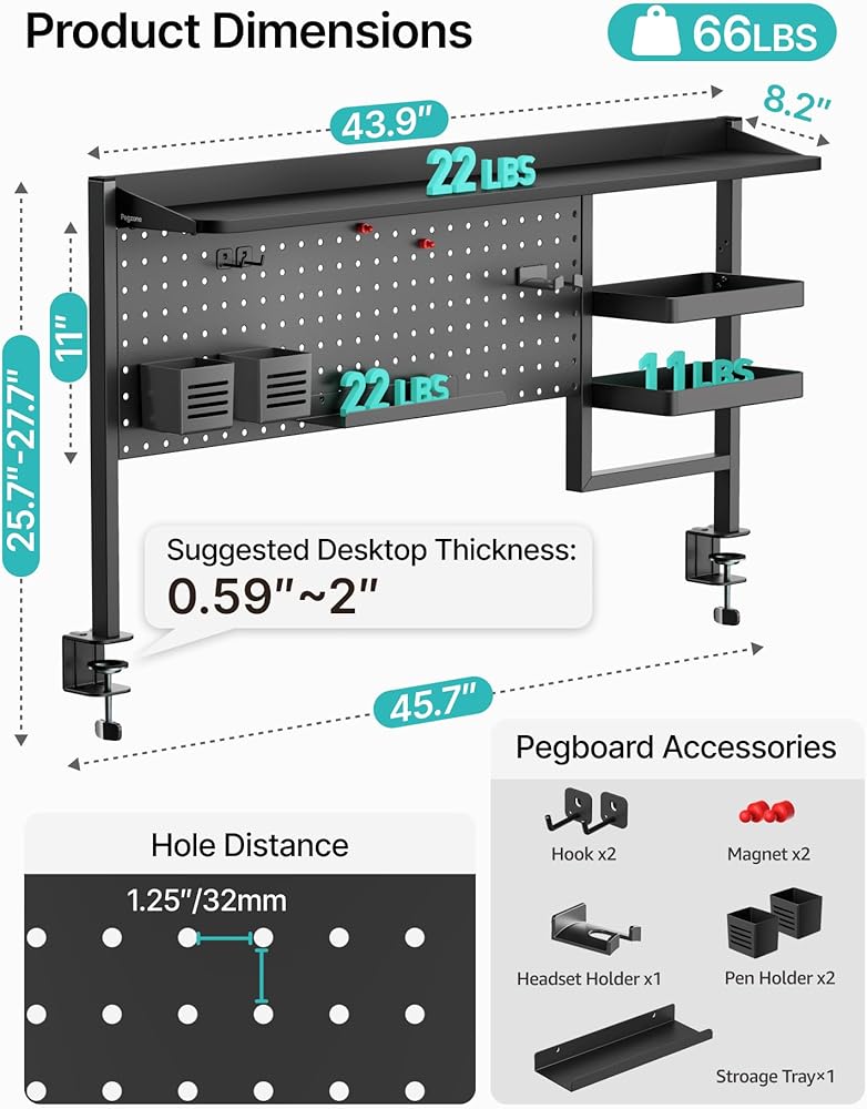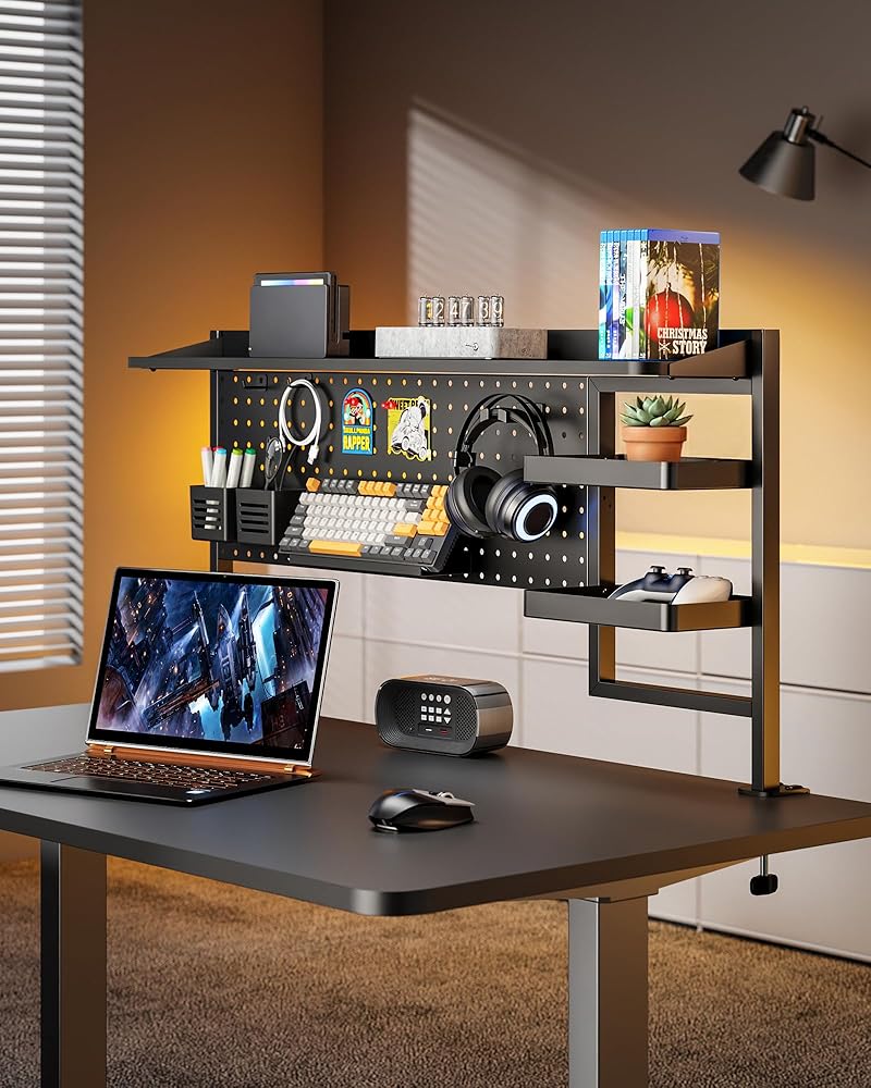 3-in-1 منظم المكتب متعدد الوظائف: يجمع هذا المشبك الشاق على الرف المكتبي بين اللوح ورف تخزين أعلى ورف من مستويين-كل ذلك في وحدة واحدة. مثالي لتنظيم الضروريات اليومية ، يأتي مع ملحقات Pegboard متعددة بما في ذلك الخطافات وحاملي القلم وحامل سماعة الرأس ودرج التخزين والمغناطيس لإنشاء حل تخزين مخصص.