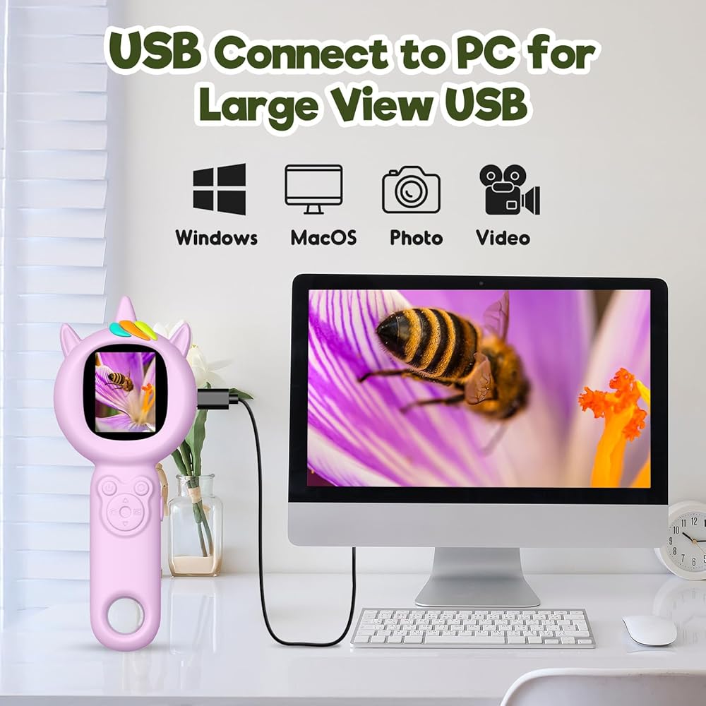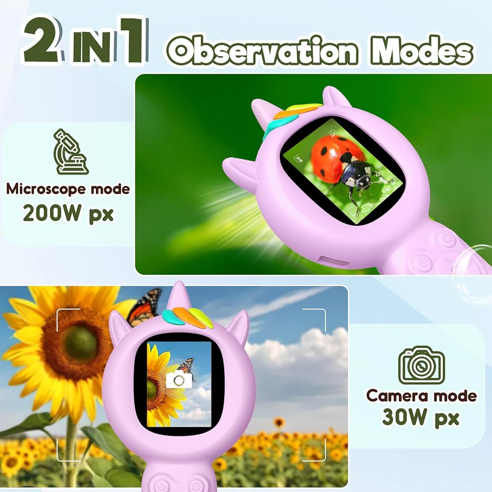 🔬 أوضاع المشاهدة الثابتة: يجمع هذا المجهر Unicorn بين التكبير المجهري مع كاميرا منتظمة لإطلاق النار لمسافات طويلة. يمكن للأطفال التبديل بين المراقبة عن قرب والتقاط مشاهد أوسع. بالإضافة إلى ذلك ، يمكن لكلا الوضعين التقاط صور للتسجيل - مثالي للاستكشاف التلقائي أثناء التنقل