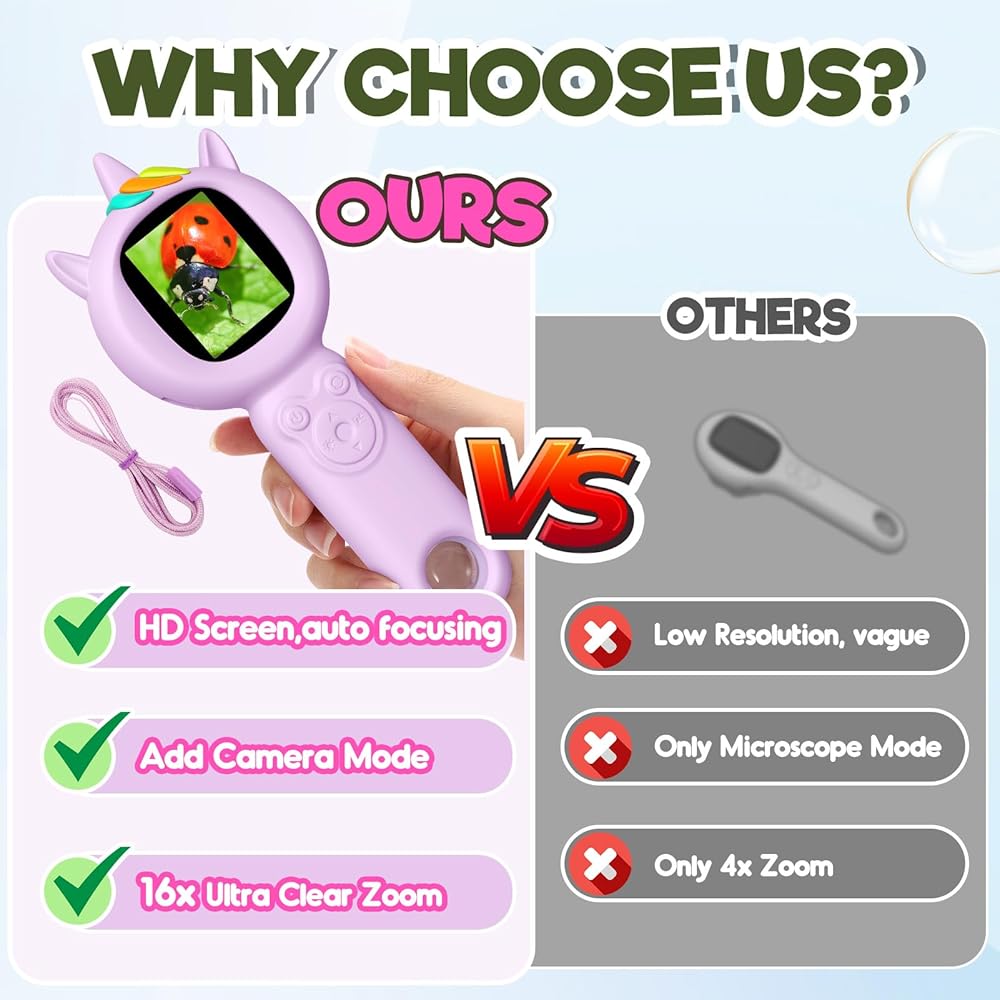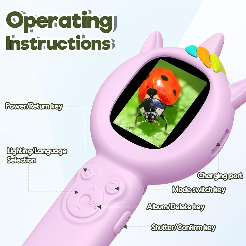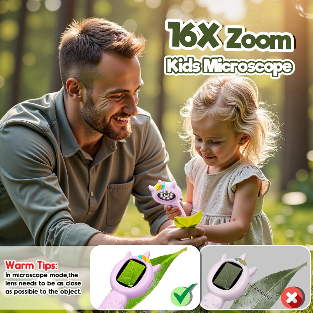 🔍magnify واستكشاف 🔍: مع التكبير 500X وتكبير 16x ، يمكن للمستكشفين الشباب الغوص في أصغر عجائب - مثل بقع الخنفساء أو قوام الأوراق. لا حاجة إلى العبث ، التركيز التلقائي يجد المتعة! تعرض شاشة IPS بحجم 2 بوصة صورًا واضحة تمامًا ، مما يجعل كل جلسة مغامرة حية ومثيرة في العلوم والاكتشاف
