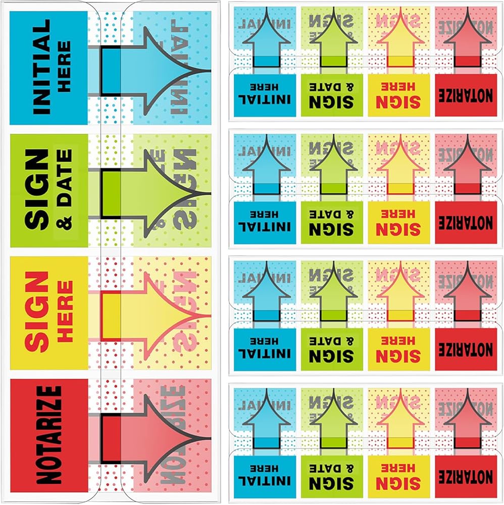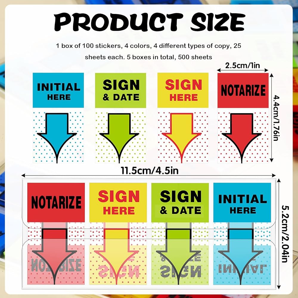 📦 مجموعة كاملة من 500 علامة توقيع: تتضمن 5 حزم من العلامات هنا ، كل حزمة تضم 4 أنماط - "تسجيل هنا" ، "الأولي هنا" ، "Sign & Date" ، و "Notarize". يأتي كل نمط باللون الأحمر والأصفر والأخضر والأزرق لما مجموعه 500 علامة لزجة.