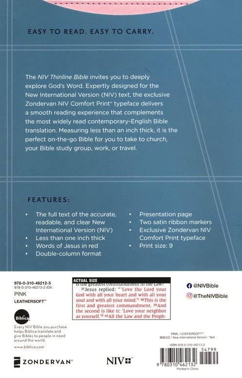 This NIV Thinline Bible captures the depth and beauty of the Bible in a take-anywhere size. This Bible delivers a pleasant reading experience. Measuring less than an inch thick, it is perfect to take to work, travel, church, and Bible study for on-the-go access to God's word.