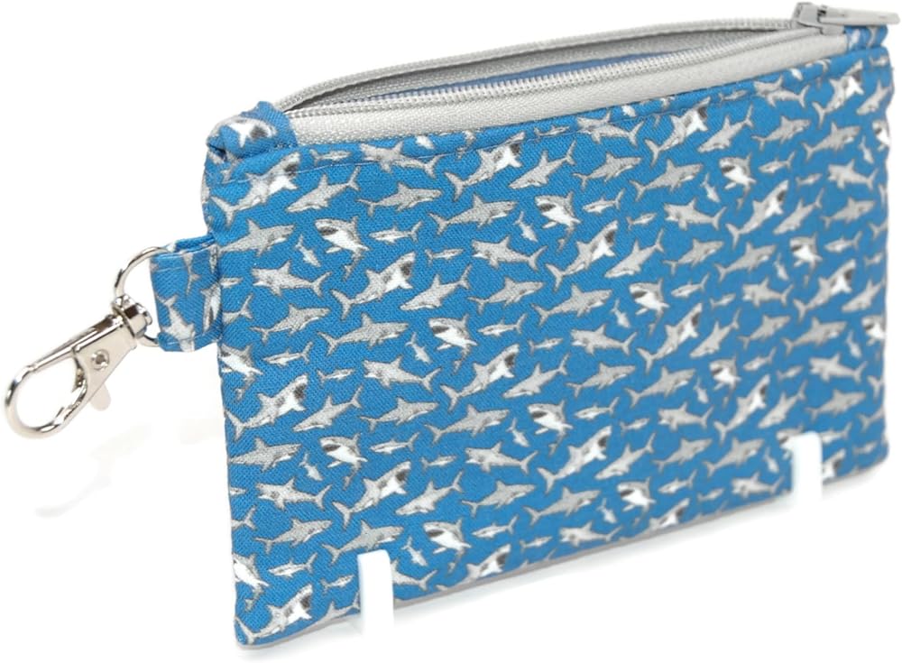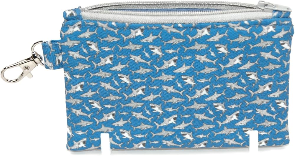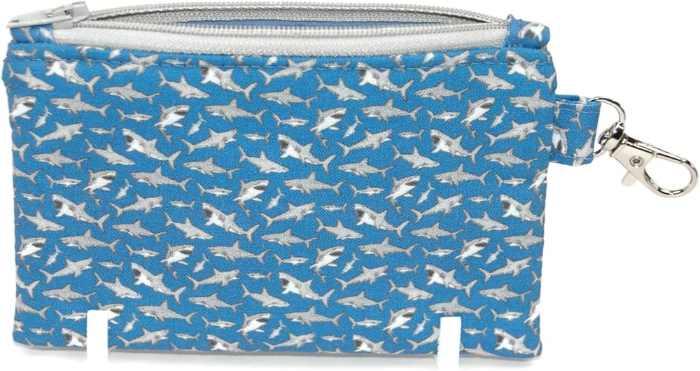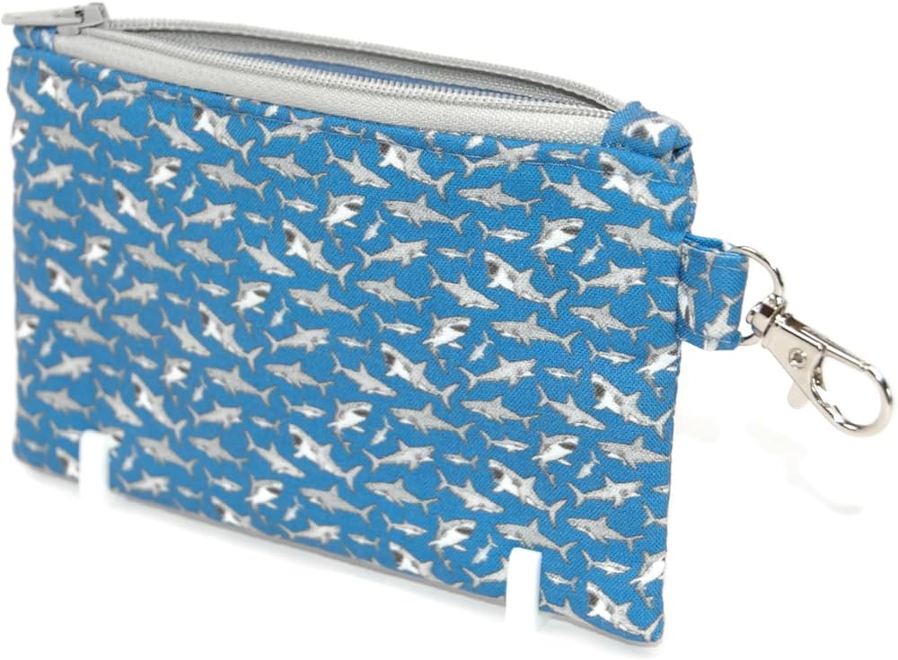 DESIGN FEATURES: Stylish shark pattern wristlet pouch in blue and silver with secure zipper closure and convenient keychain attachment