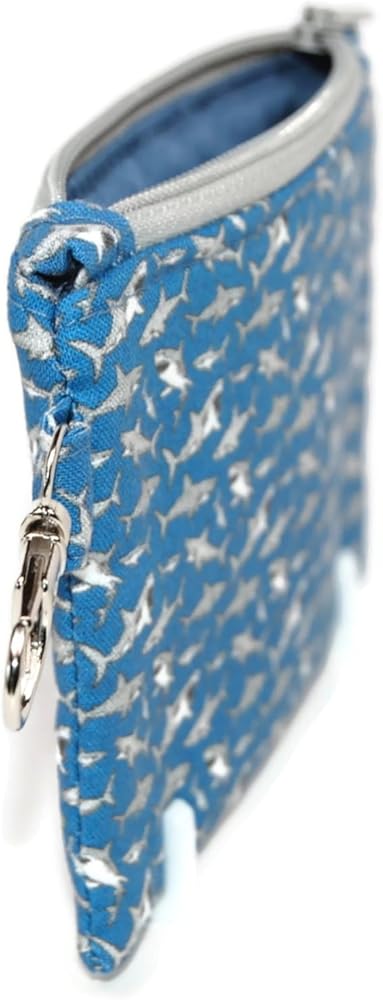Make a splash with this charming shark-themed wristlet pouch! The vibrant blue background features an all-over pattern of playful silver sharks swimming in perfect formation. This compact accessory comes with a convenient wristlet strap and sturdy metal clasp, making it perfect for keeping your essentials secure and close at hand. The smooth zipper closure opens to reveal a practical interior space, ideal for storing small items like cards, cash, or cosmetics. Crafted with durable fabric and quality construction, this wristlet combines whimsical style with practical functionality. The versatile size makes it perfect for everyday use or as a fun organizing solution within a larger bag. Whether you're a marine life enthusiast or simply love unique accessories, this shark-print pouch adds a playful touch to your daily carry essentials.