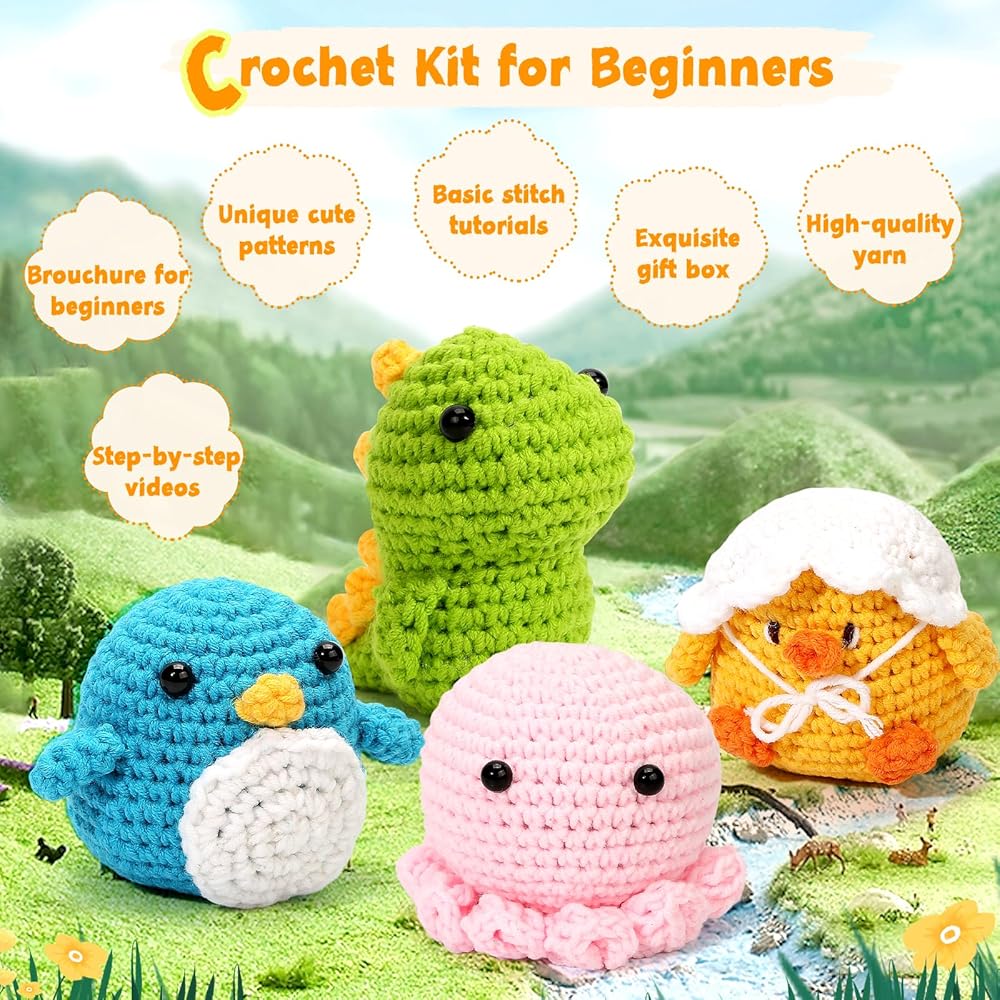 مجموعات الكروشيه للمبتدئين ، مجموعات المبتدئين مع دروس فيديو خطوة بخطوة-هدية مثالية للبالغين ، الأطفال ، عشاق الكروشيه ، هدية مثالية لعيد الميلاد ، عيد الميلاد ، 4 أنماط لطيفة مع خيوط إضافية