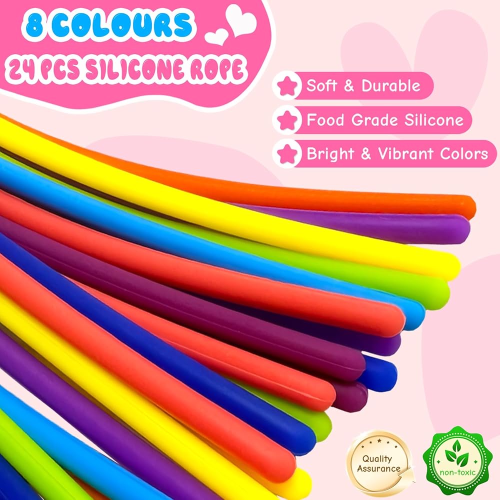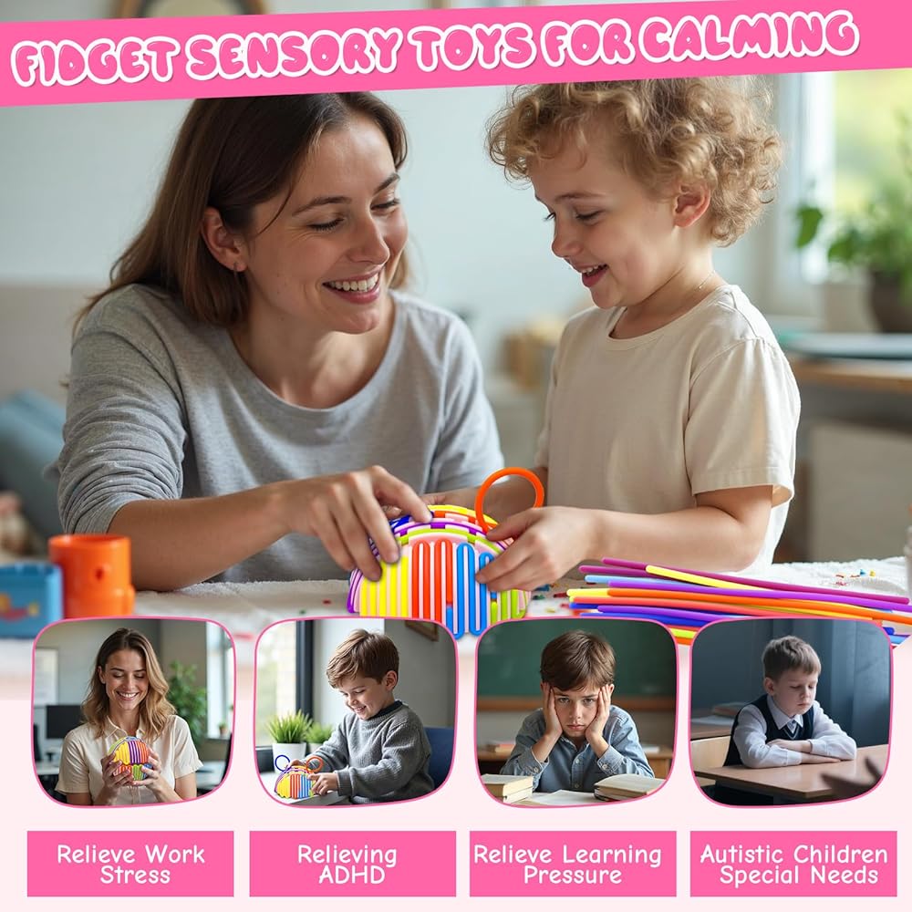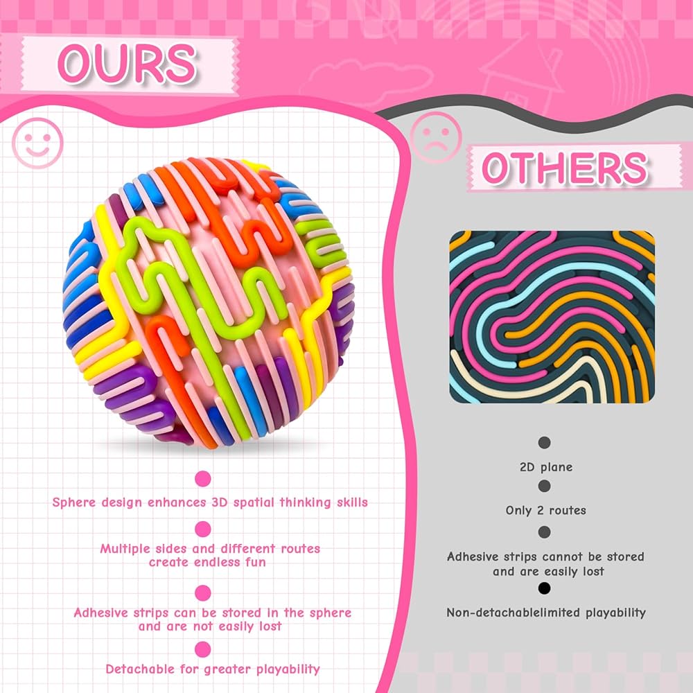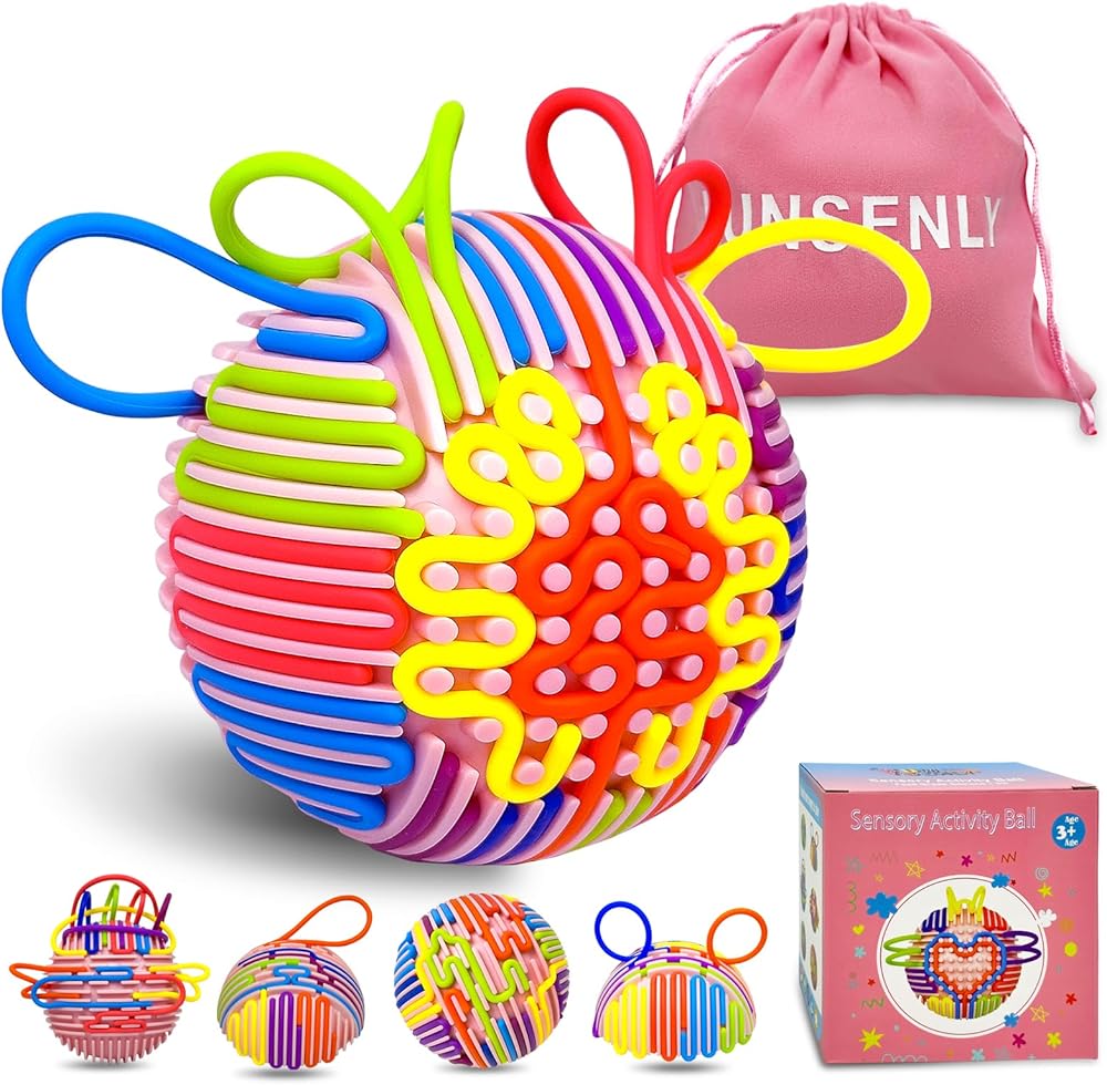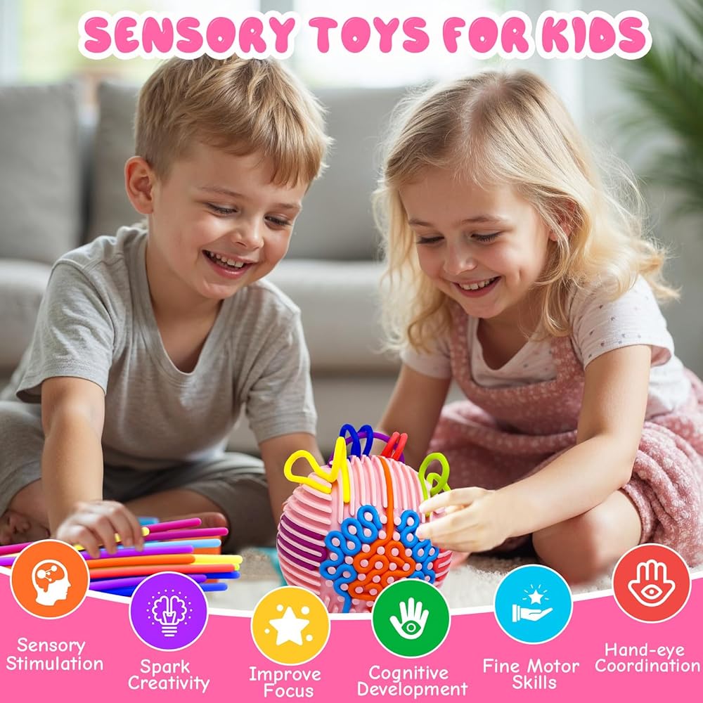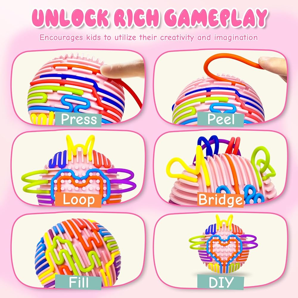 Immersive Sensory Fun: Upgraded from the sensory activity board, this sensory toy comes with 24 colorful silicone strings and a textured pink ball. Create colorful patterns and 3D shapes through press, peel, loop, bridge, fill and other actions, which can not only stimulate children's imagination and creativity, but also improve fine motor skills and hand-eye coordination