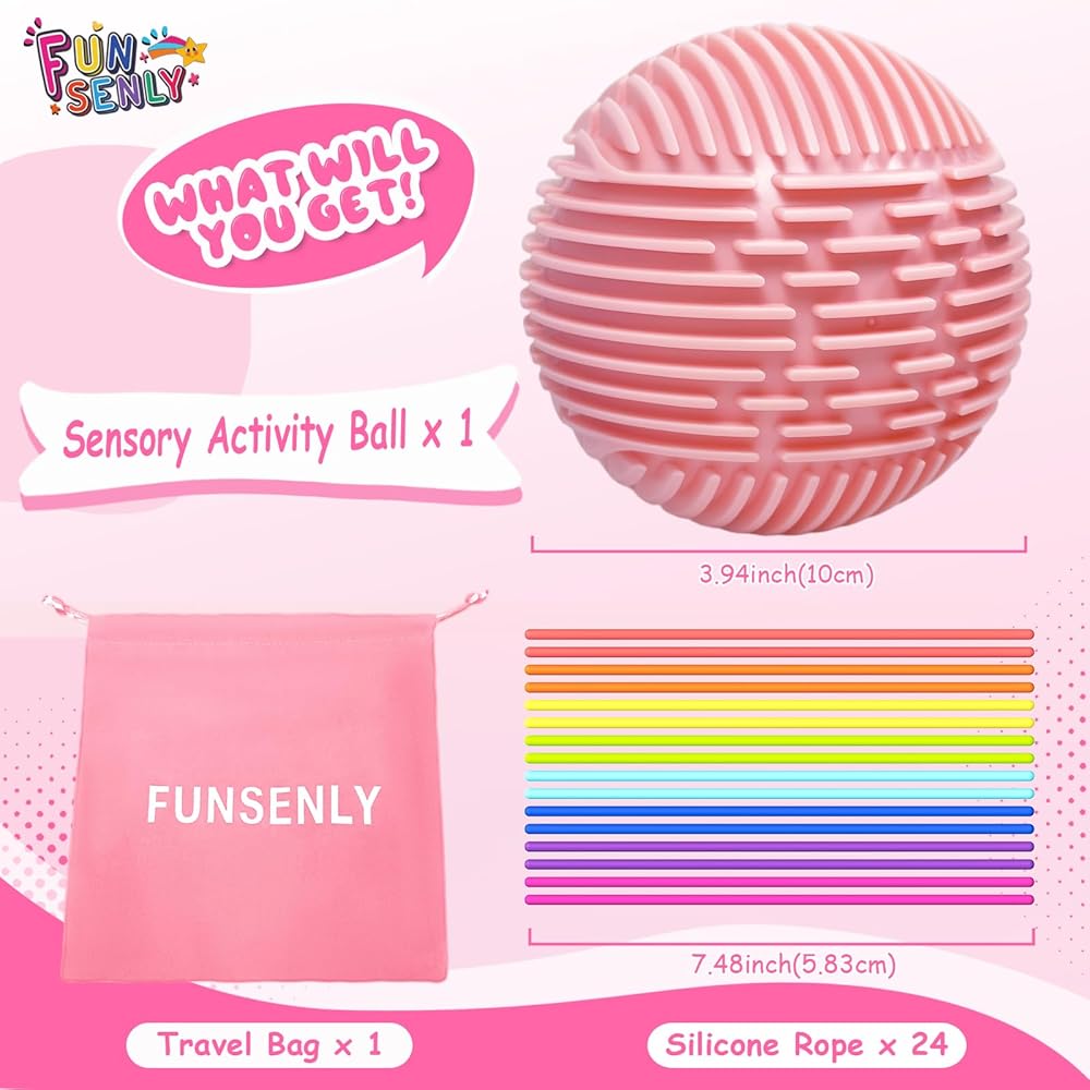 FUNSENLY Kids Sensory Fidget Toys Adults Anxiety, 3D Sensory Activity Ball for Autism Adhd Tools with 24 Strings Portable Bag, Toddler Travel Toys Airplane Roadtrip for Boy Girl Birthday Gift(Pink)