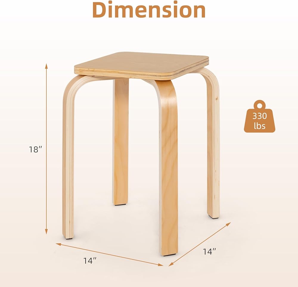 Provide extra seating area with our 4 square backless stools! Our stools set of 4 can be used as small coffee tables, vanity chairs or dining room chairs, allowing you to enjoy afternoon teas, make up or eat meals. Premium poplar wood and birch wood materials make each stool strong and durable enough to bear a weight up to 330 lbs. 3-screw reinforced design, solid legs and non-slip foot pads keep it stable and steady. What's more, you can stack our stools to save space after use. Burr-free edges ensure safe use, while polished surface allows for easy cleaning. In addition, with the help of our detailed instruction, you will never get stuck in assembling.