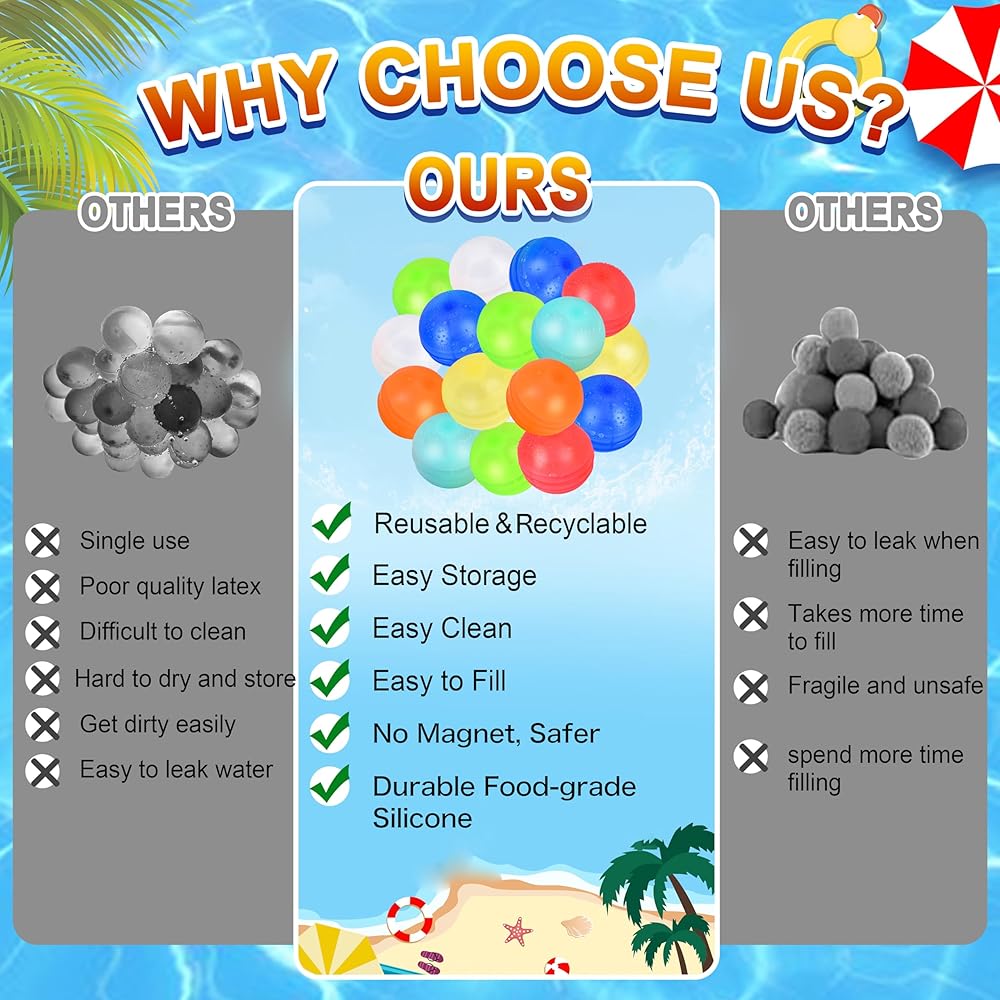 التصميم القابل لإعادة الاستخدام: البالونات المائية القابلة لإعادة الاستخدام لدينا متينة للغاية ومقاومة للدموع ، والتي يمكن استخدامها أكثر من 1500 مرة. يمكن مليئة بالمياه لأوقات غير محدودة ، متينة للغاية وطويلة الأمد للأنشطة الصيفية في الهواء الطلق متعة