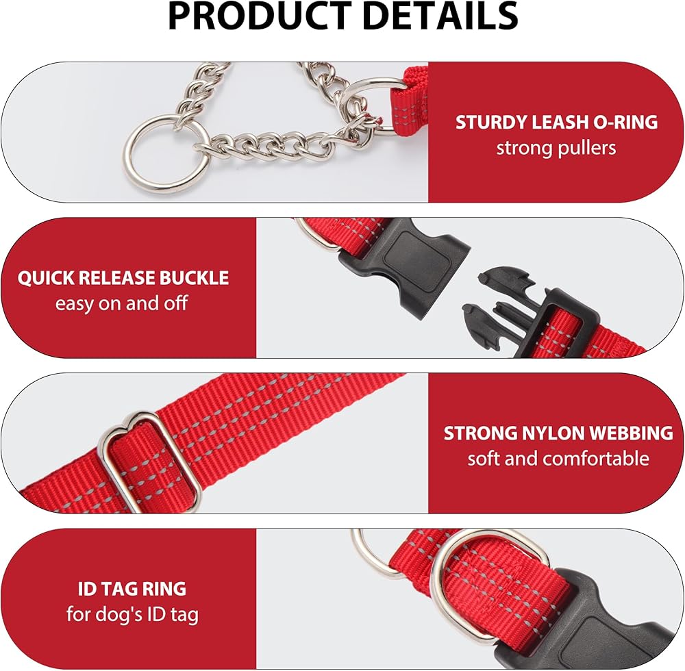مشبك سريع للإصدار: تم تصميم طوق Martingale المتسلسل من حزام النايلون عالي الكثافة ؛ الأجهزة الثقيلة للخدمة الشديدة ؛ ووكبليًا سريعًا ؛ في حالة طوارئ ؛ يمكن فتحه بسرعة ؛ ولأن درجة التشديد محدودة ؛ فمن غير المرجح أن تسبب قمعًا خطيرًا لعنق الكلب