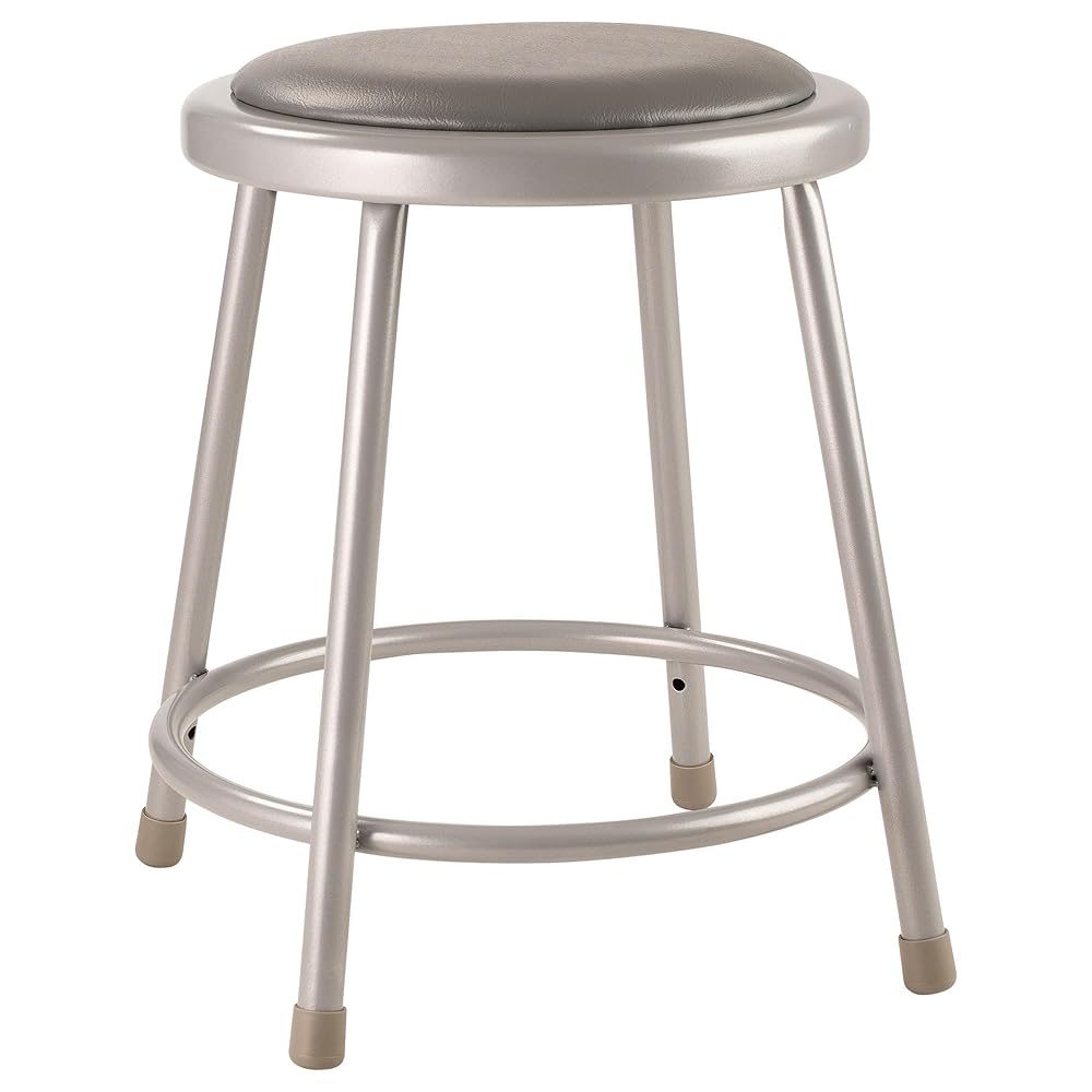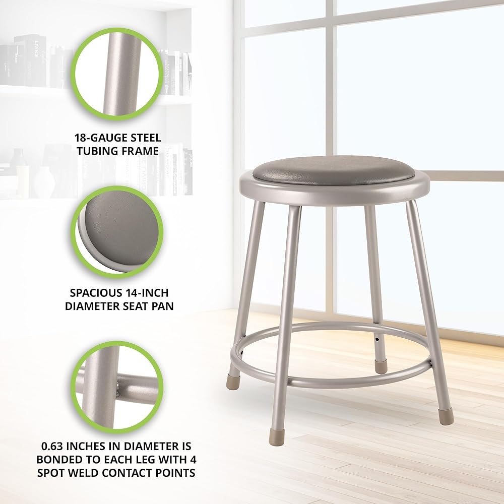 This steel stool is durable and versatile. Strong 18 Gauge steel frame is designed to last for years. Comfortable padded seat is vinyl upholstered. Steel frame is grey powder coated. Stool is rated for 300 lbs. weight capacity. Comes with grey non-marring floor glides. This model is 18" high.