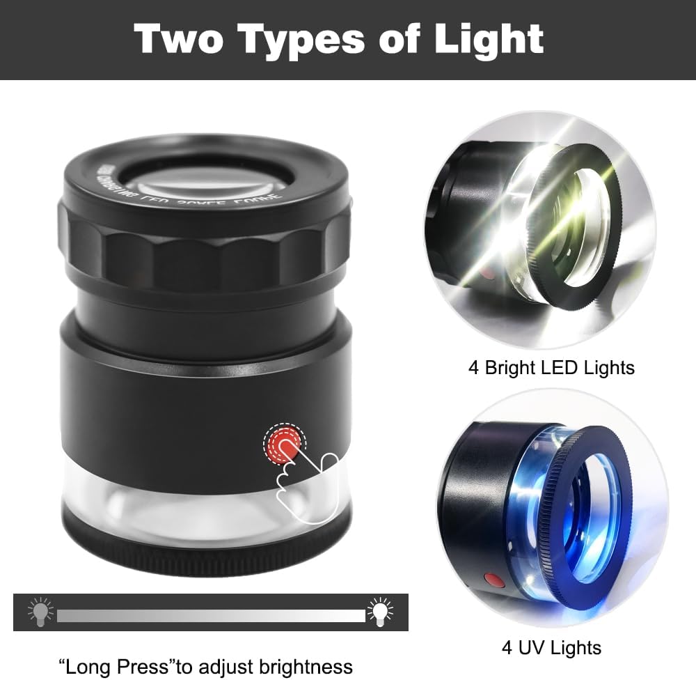 【مصابيح LED و UV متوفرة】 هذه المجوهرات القابلة لإعادة الشحن لها LOUPE مع الضوء لها مصابيح وضع مزدوجة ، 4 LED ضوء أبيض و 4 UV. ما عليك سوى الضغط مع الاستمرار على الزر في وضع إضاءة LED الأبيض لضبط سطوع الإضاءة. يمكن تعديله بلا حدود بين القوي القوي أو الضعيف. اختر سطوع الإضاءة الأنسب وفقًا لبيئات الاستخدام المختلفة