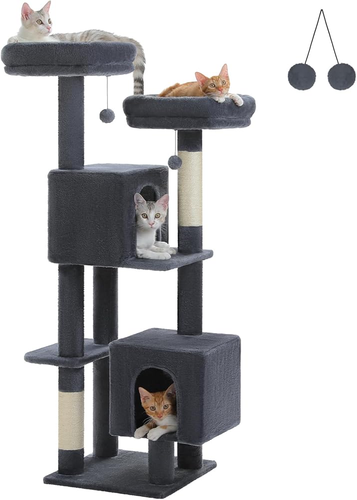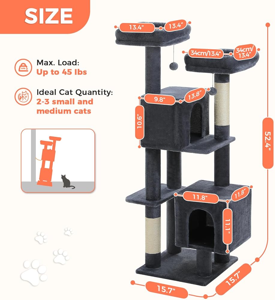 ملاذ متعدد القطط مع 4 مناطق راحة: شجرة القط الكبيرة هذه هي مساحات مثالية للطبقة المركزية للقطط 2-4. تم تصميم برج شجرة القطط ، الذي تم تصميمه للأسر متعددة القطط ، على عجلتين أعلى (11.8 "x11.8") + 2 كهوف مزدوجة الدخول. تم تصميم الكهف الفسيح (18.9 "x11.8" x11 ") للقطط الكبيرة ، في حين أن الشقة العليا المدمجة تناسب القطط-مما يجعل مناطق خالية من الصراع.