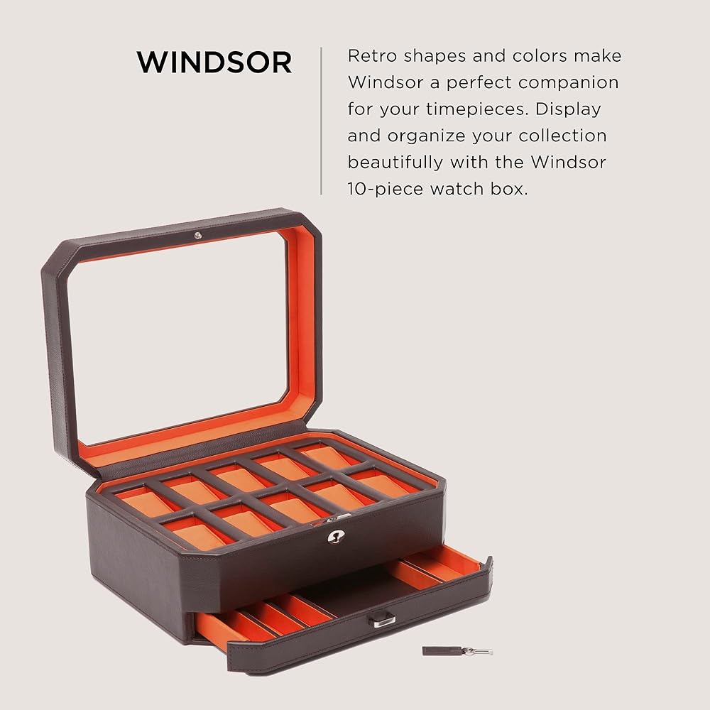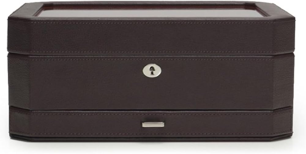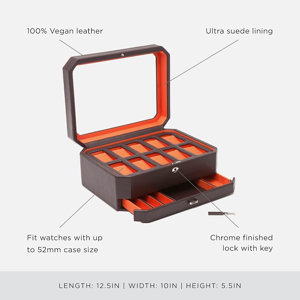 صندوق ساعة مستوحى من منتصف القرن - صندوق تخزين الساعات مكون من 10 قطع، و8 لفافات للخواتم و17 فتحة لأزرار الأكمام والمجوهرات، مع قطع معدنية مطلية بالكروم وغطاء زجاجي للإغلاق