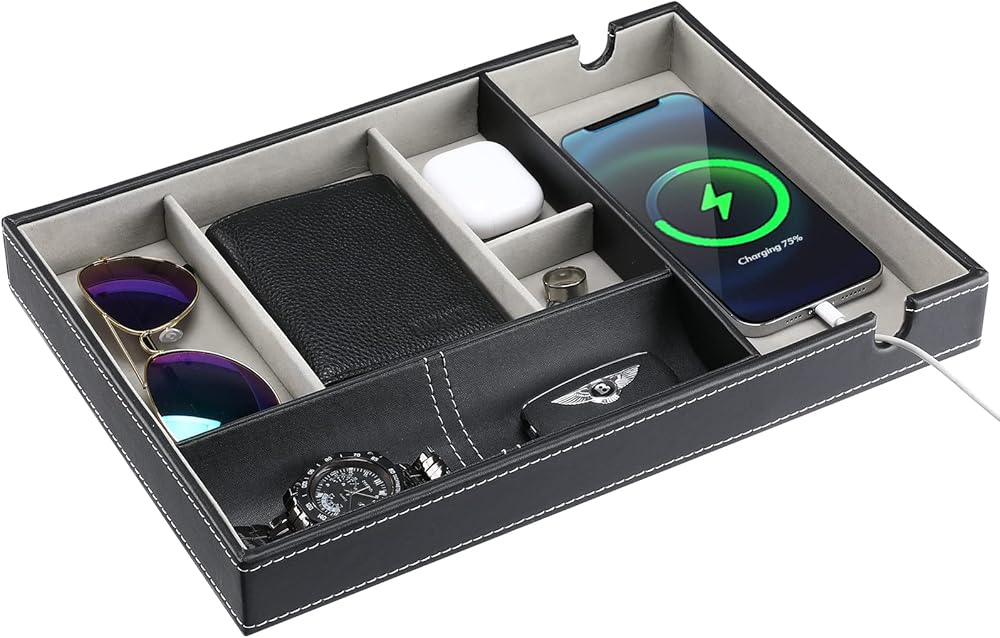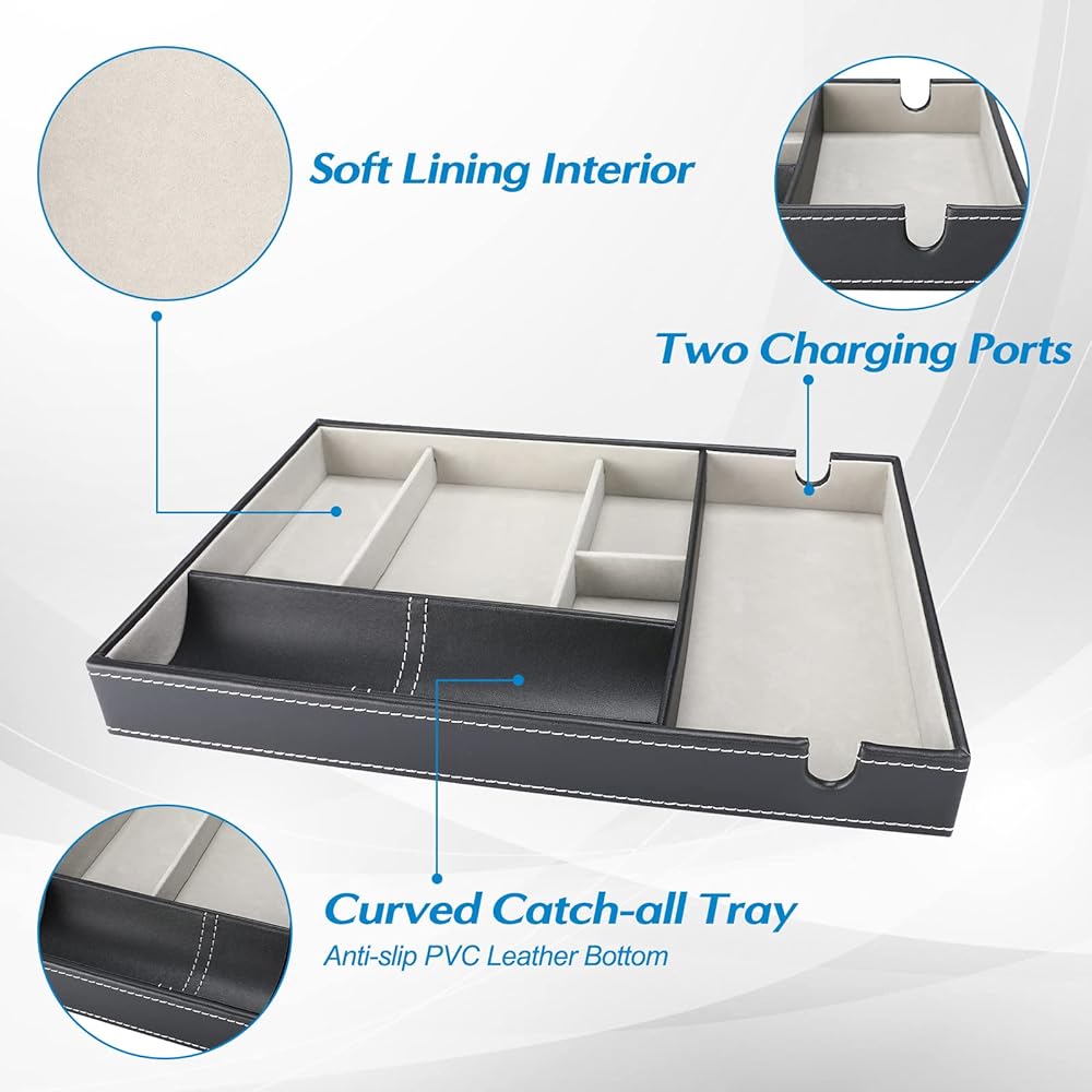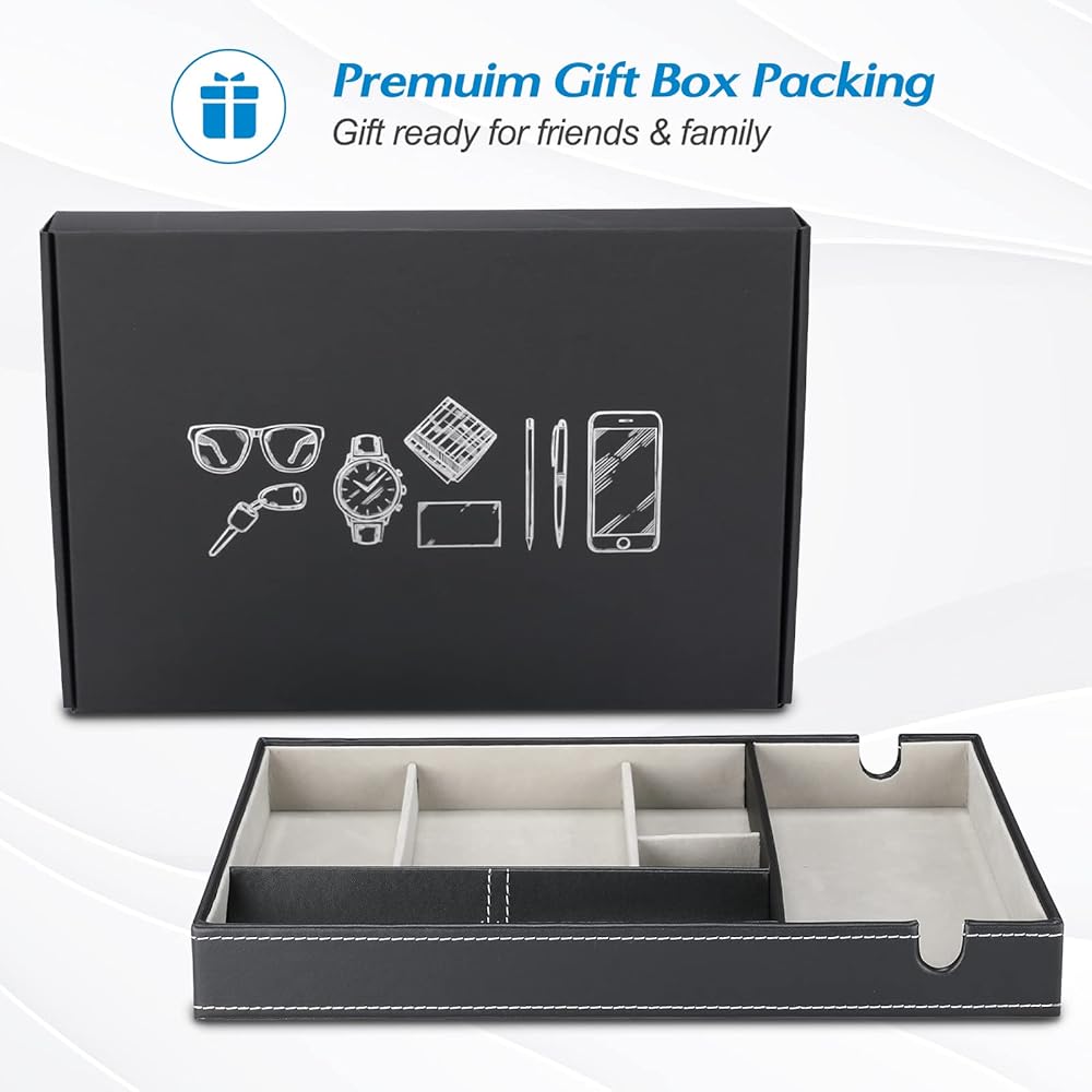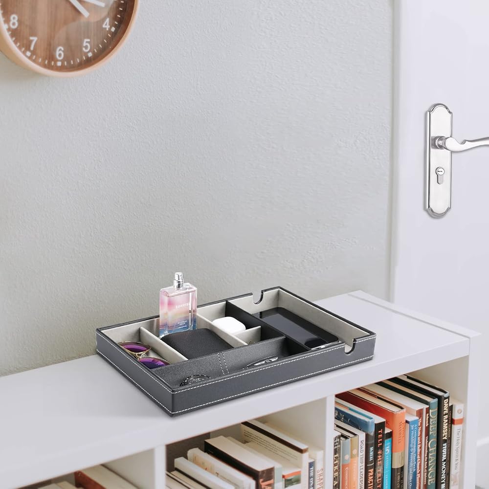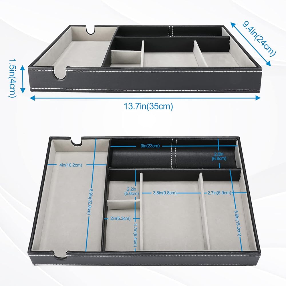• ✅ Easily organize and keep everything in one place on your dresser or nightstand, perfect for storing smartphone, wallet, keys, eyeglasses, watches, jewelry, cash, coins, pens and ect., no more "dumping" items on your table at the entryway