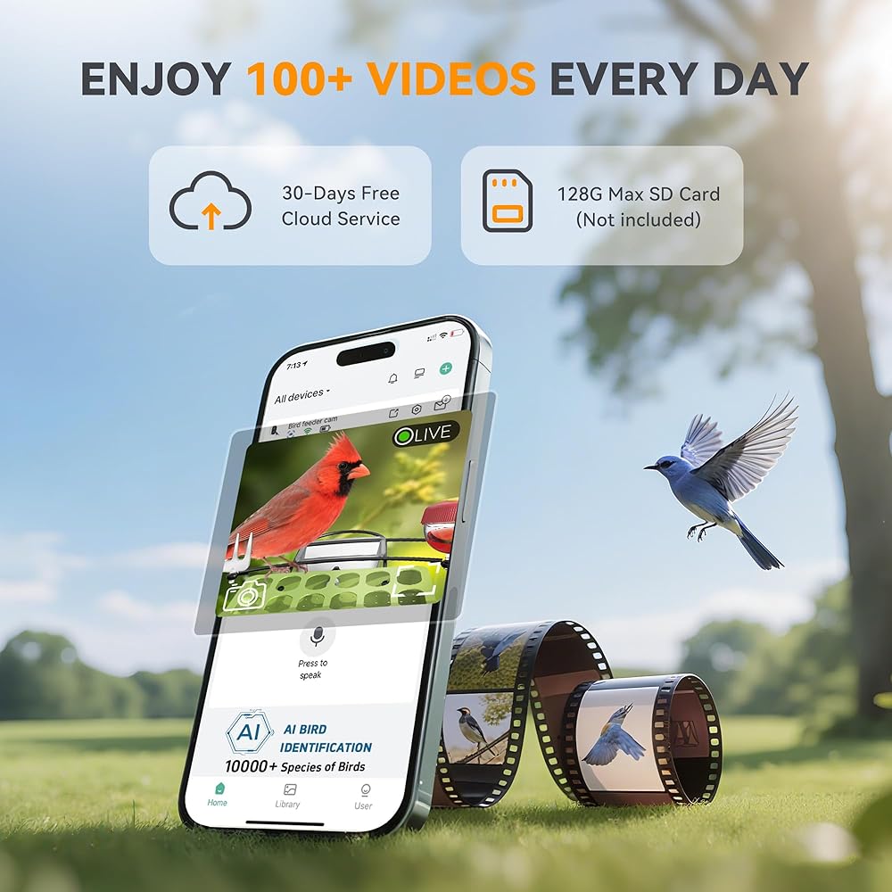 • AI Bird التعرف على تطبيق Vicohome: تحدد كاميرا تغذية الطيور هذه بدقة أكثر من 10000 نوع من الطيور باستخدام تطبيق Vicohome ، مما يساعدك على تعميق فهمك للطيور في البرية. استمتع بالوصول المجاني إلى 3 أيام من تشغيل الفيديو السحابي. الاشتراك يفتح تاريخ الفيديو الأطول والميزات المتميزة. تخزين محلي متاح مع دعم بطاقة Micro SD حتى 128 جيجابايت (بطاقة غير متضمنة)