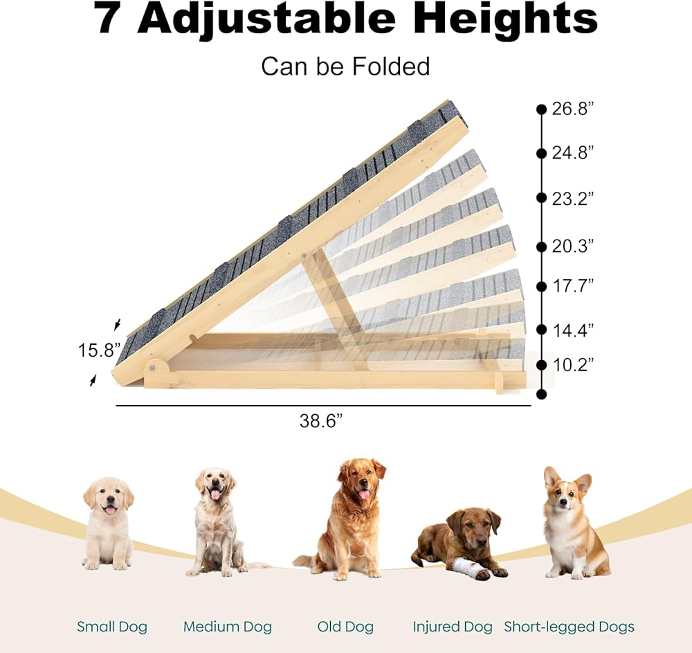 4 Adujustable Heights: TIMHAKA Pet ramp has 4 heights for you to choose from. From 21.3 inches to 26 inches, simply adjust the height of the ramp according to your needs to help your pets get on and off the bed, sofa and car. The gentle ramp is perfect for small dogs, medium dogs and large dogs.