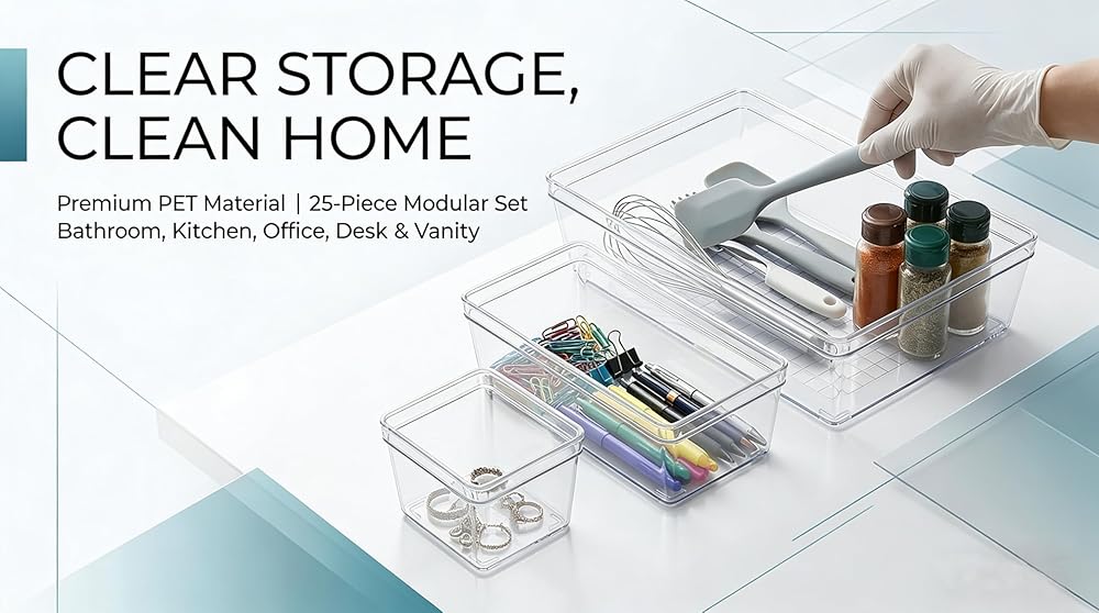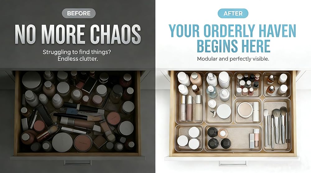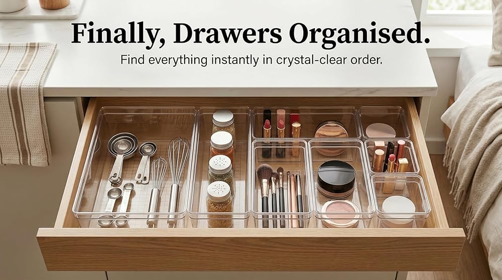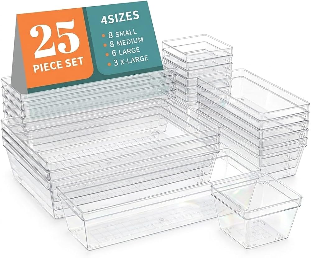 Stay Organized: Drawer organizers makeup vanity drawer organizer make organization a part of your life. Bathroom drawer organizer trays organize your storage space in home Save Space drawer organization: Makeup organizer for drawer make more space at home for daily storage Easy to clean makeup drawer organizer trays: Simply wipe the drawer organizer bathroom bathroom organizer drawer or a quick water rinse drawer makeup organizer to get dust and dirt off the make up drawer organizer set Multipurpose clear plastic drawer organizer: Our drawer organizer tray are designed to be used in multiple situations, with different drawer storage containers tray sizes to customize your storage space Plastic drawer organizer package Includes: 9 x 6 x 2 inches (3 pcs) 9 x 3 x 2 inches (6 pcs) 6 x 3 x 2 inches (8 pcs) 3 x 3 x 2 inches (8 pcs)