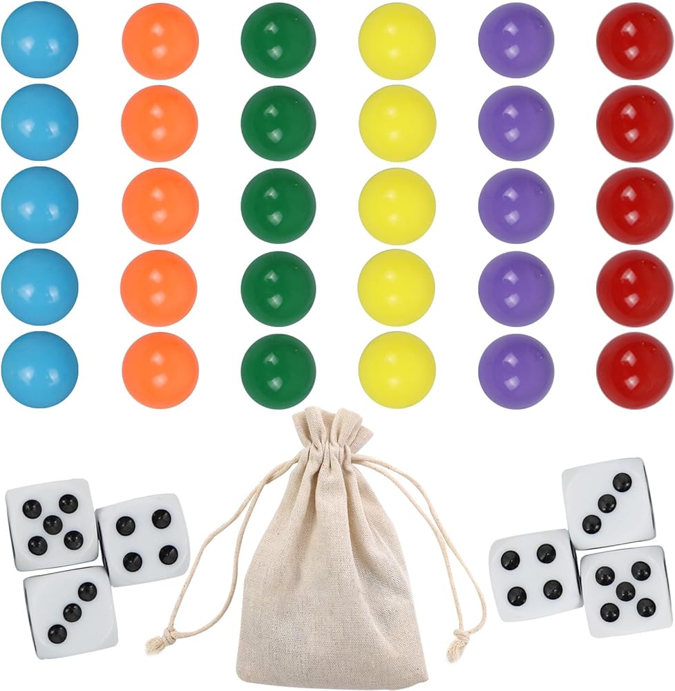 【Exquisite Marbles】 contains 30 marbles in 6 colors(red、yellow、blue、green、purple、orange),each color of 5 which can meet your entertainment needs,30 Marbles and 6 Dice in a Cloth Carry Pouch,Marbles are 1/2" (14mm) in size.