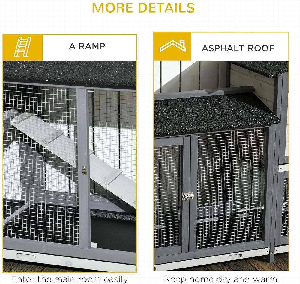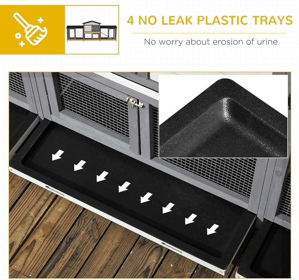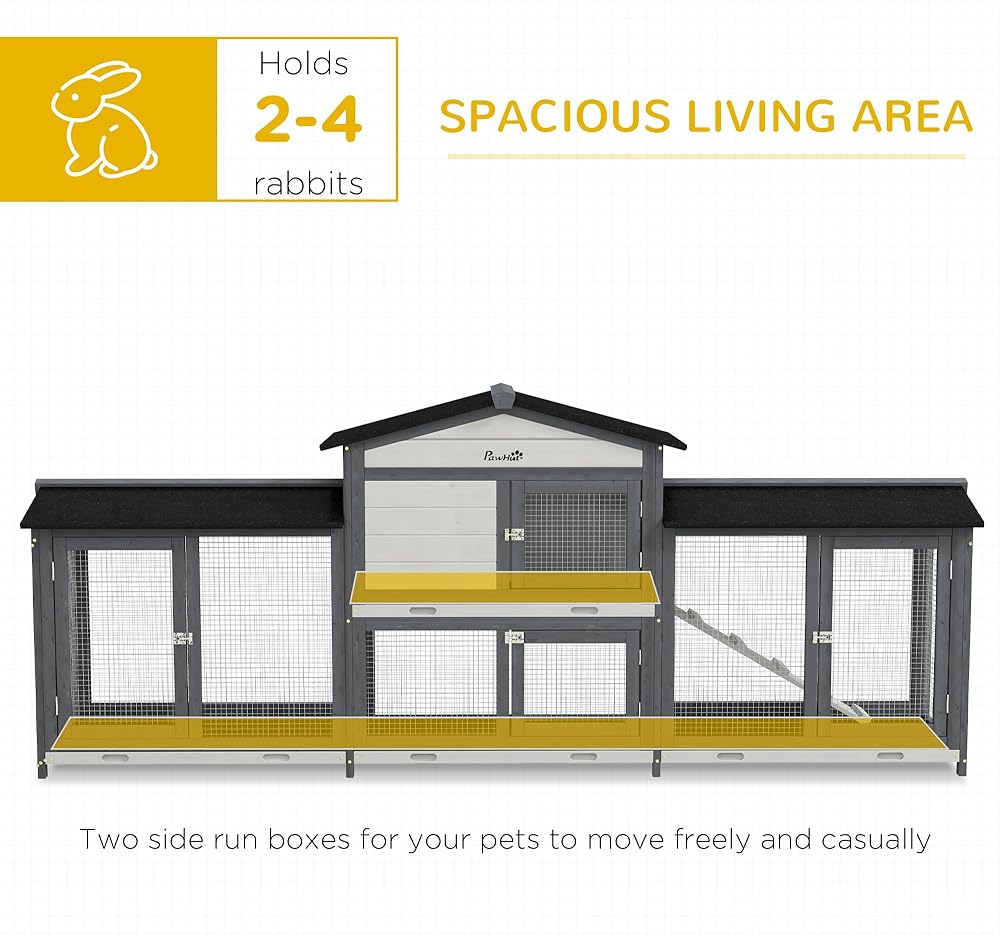 التصميم الفسيح: وفر قفص أرنب مع مساحة كبيرة بفضل صناديق الجري الكبيرة الإضافية ، مما يمنحهم الكثير من المساحة للتجول.