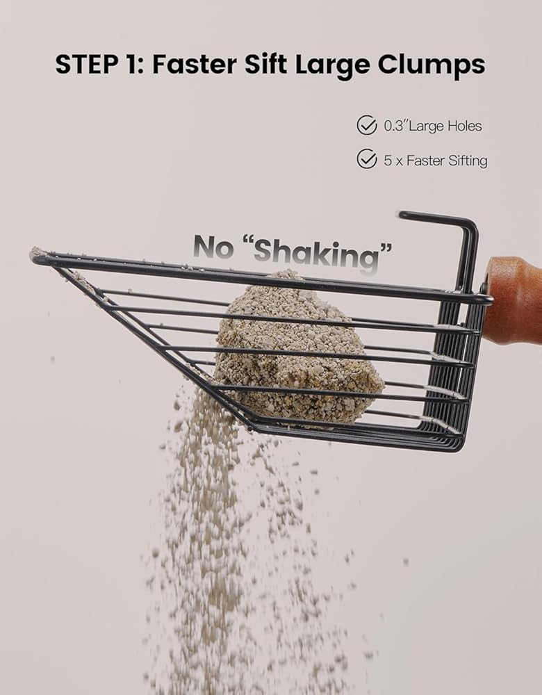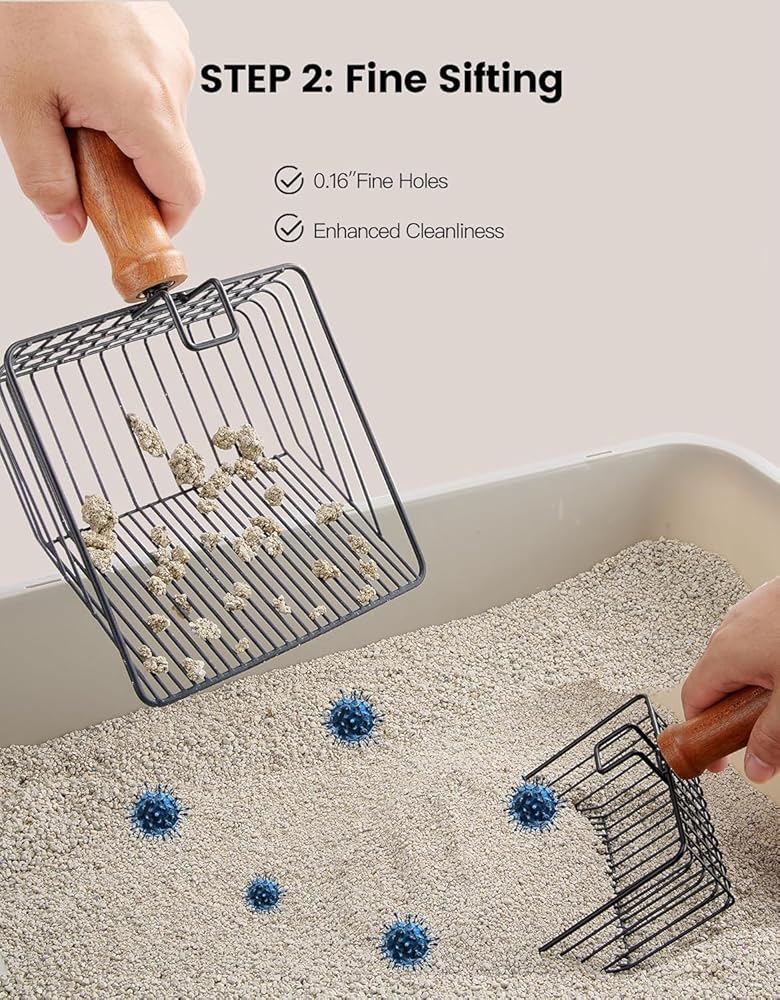 SIFT Lightning Sift & Fine Sift - الخطوة 1 هي إزالة كتل كبيرة ، أسرع 5x من مغارب القمامة الأخرى. الخطوة 2 ، استخدم شبكة غرامة الأمامية لخلع جميع مجموعات البول الصغيرة ، مما يلغي جميع الروائح.