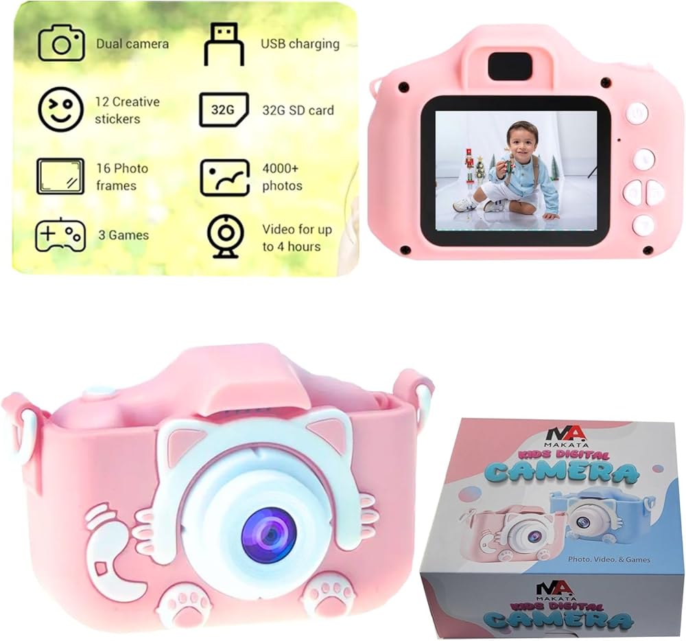 This multifunctional mini-size camera supports photo taking, video and audio recording, games, and MP3 music. It is very lightweight, durable, and easy to operate, which makes it suitable for kids. It offers self-timer, continuous shooting, selfie mode, and stickers. Kids have the extra accessories for their photo adventure, include 32MG memory card.
