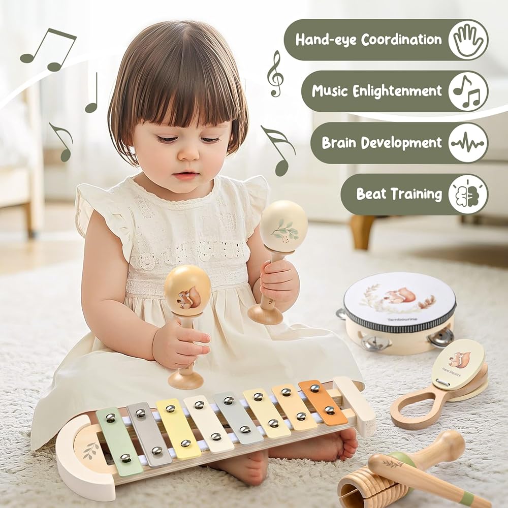 ألعاب التعلم في مرحلة ما قبل المدرسة: كل أداة في هذه المجموعة الموسيقية الصغيرة تثير جزءًا مختلفًا من رحلة طفلك الموسيقية! يقدم الزيلوفون اللحن ، مما يساعد الصغار على التمييز بين الملاحظات العالية والمنخفضة. يهز الماراكاس يقوي قبضة ويبني شعور طبيعي بالإيقاع. إن ضرب المثلث يعلم التوقيت والدقة ، في حين أن النقر على الدف يشجع التنسيق بينما يتجنب الأطفال يدق للحركة. يحول Castanet حركات اليد البسيطة إلى إيقاع حيوي ، مما يجعل الإيقاع ممتعًا وبديهيًا. مع كل مسرحية ، يطور الأطفال الوعي الموسيقي والإبداع والثقة