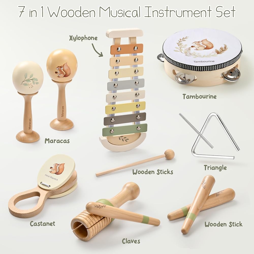 الآلات الموسيقية الصغيرة: قدم طفلك الصغير إلى عالم الإيقاع واللحن مع مجموعة الآلات الموسيقية للأطفال المكونة من 7 قطع. ويشمل إكسيليفون للأطفال الصغار 1-3 ، الدف ، أسطيل خشبي ، مثلث ، اثنين من الماراكا ، كاستانيت ، وثلاث عصي خشبية. تنتج كل أداة صوتًا فريدًا ، مما يسمح للأطفال باستكشاف نغمات وإيقاعات مختلفة. من الدقات الساطعة للوكيلوفون إلى الرنين العميق لأسلم الخشب ، تجلب هذه المجموعة مجموعة كاملة من المرح الموسيقي للموسيقيين الناشئين
