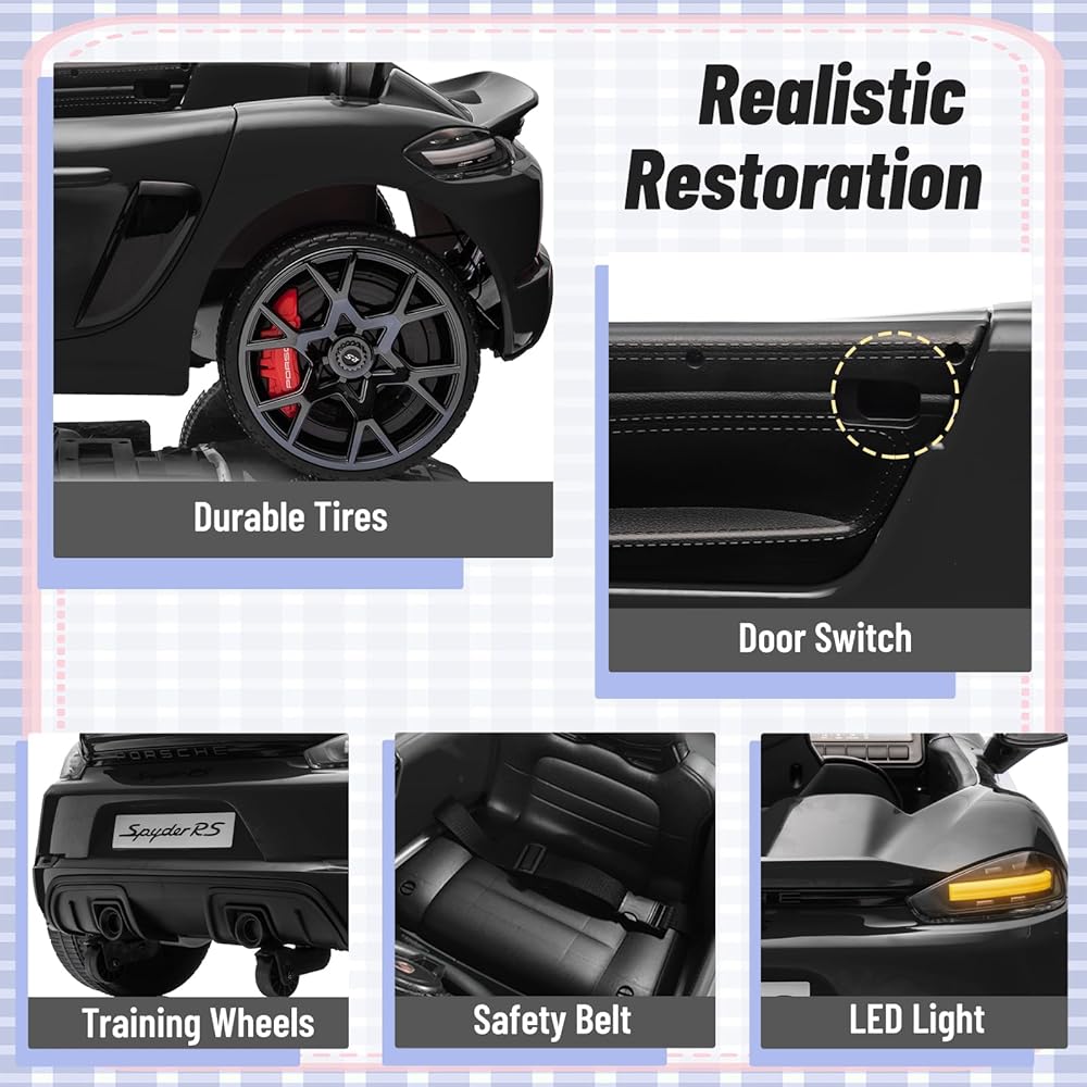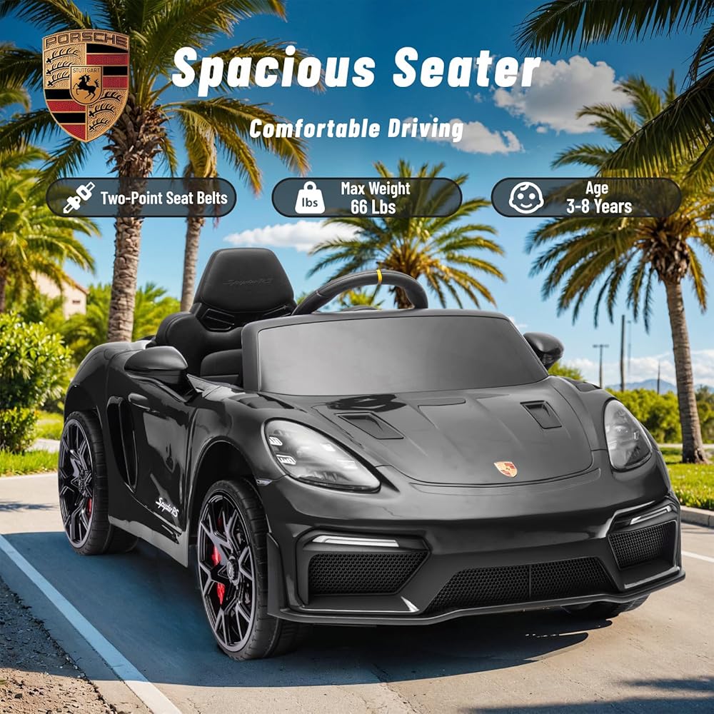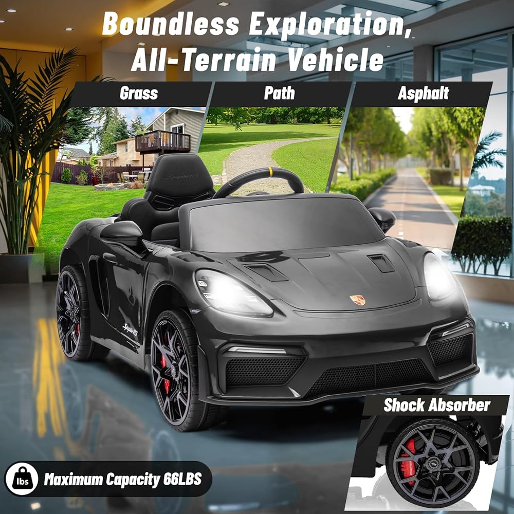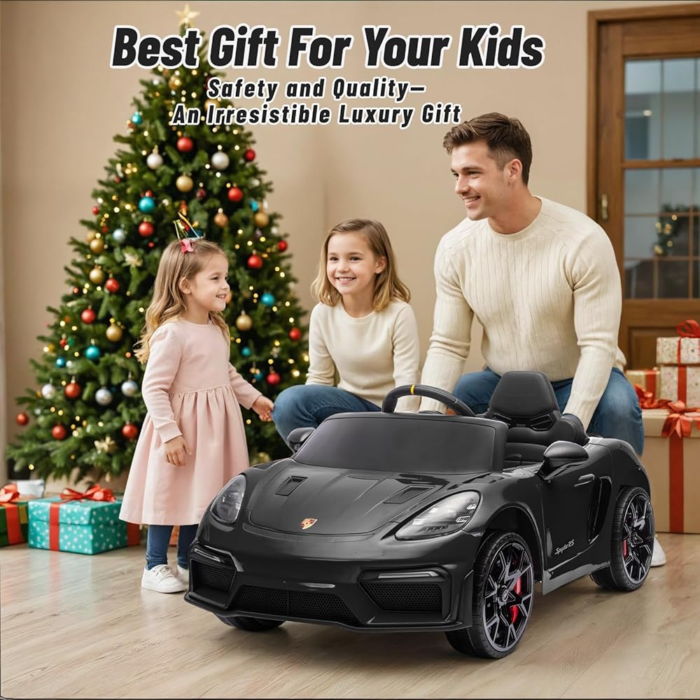 12 فولت ركوب على سيارة بورش 718 ، سيارة كهربائية للأطفال مع التحكم عن بعد ، ضوء LED الأمامي/الخلفي ، الراديو ، USB/AUX ، الأبواب المفتوحة ، وظيفة التعليق ، إطارات متينة (أسود)