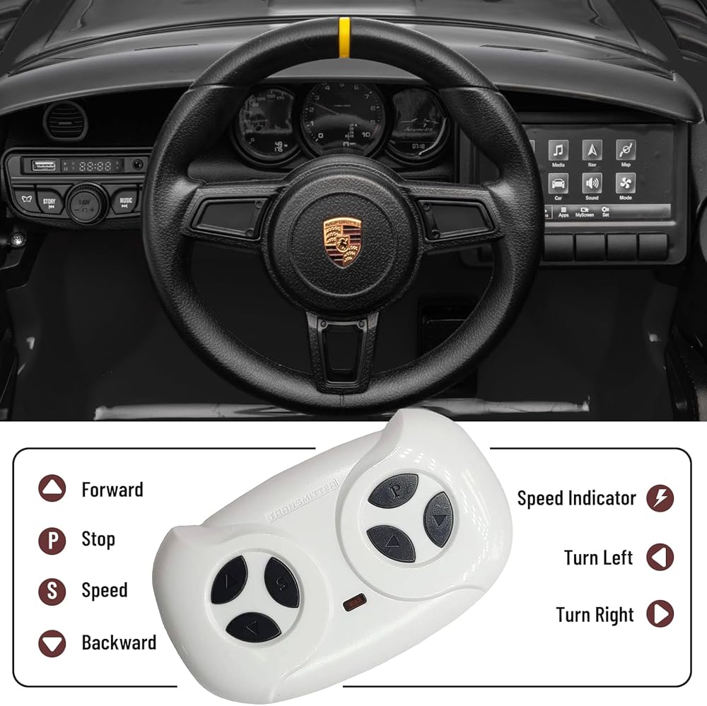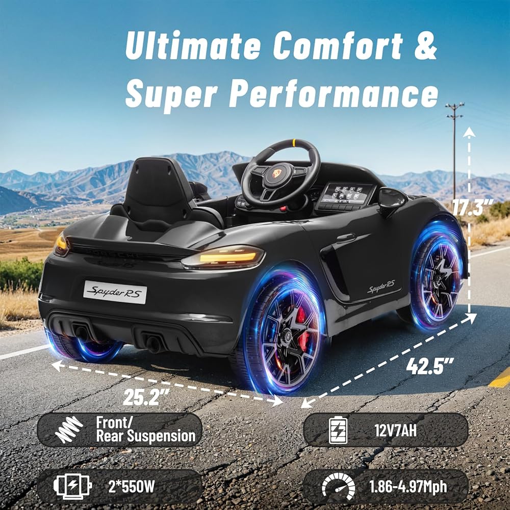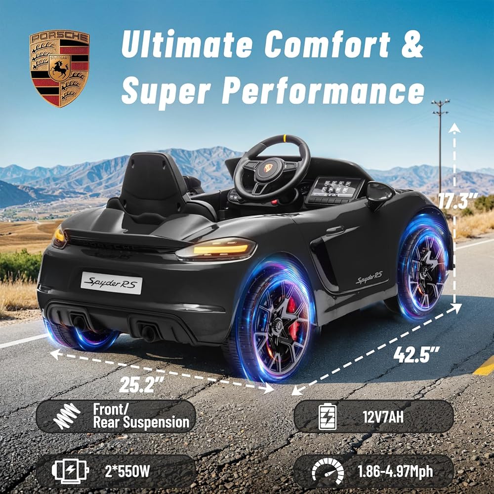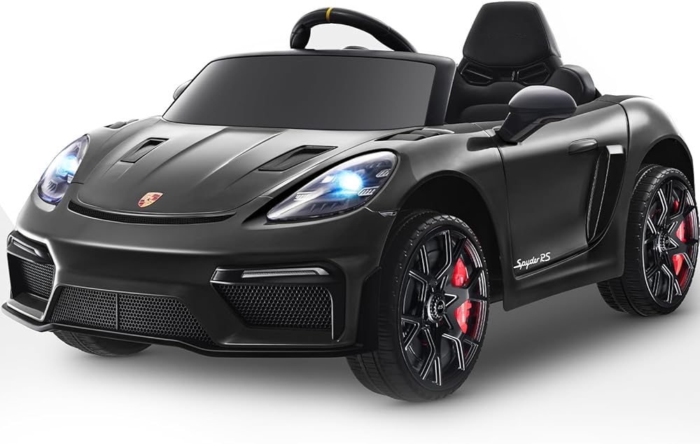 12 فولت ركوب على سيارة بورش 718 ، سيارة كهربائية للأطفال مع التحكم عن بعد ، ضوء LED الأمامي/الخلفي ، الراديو ، USB/AUX ، الأبواب المفتوحة ، وظيفة التعليق ، إطارات متينة (أسود)