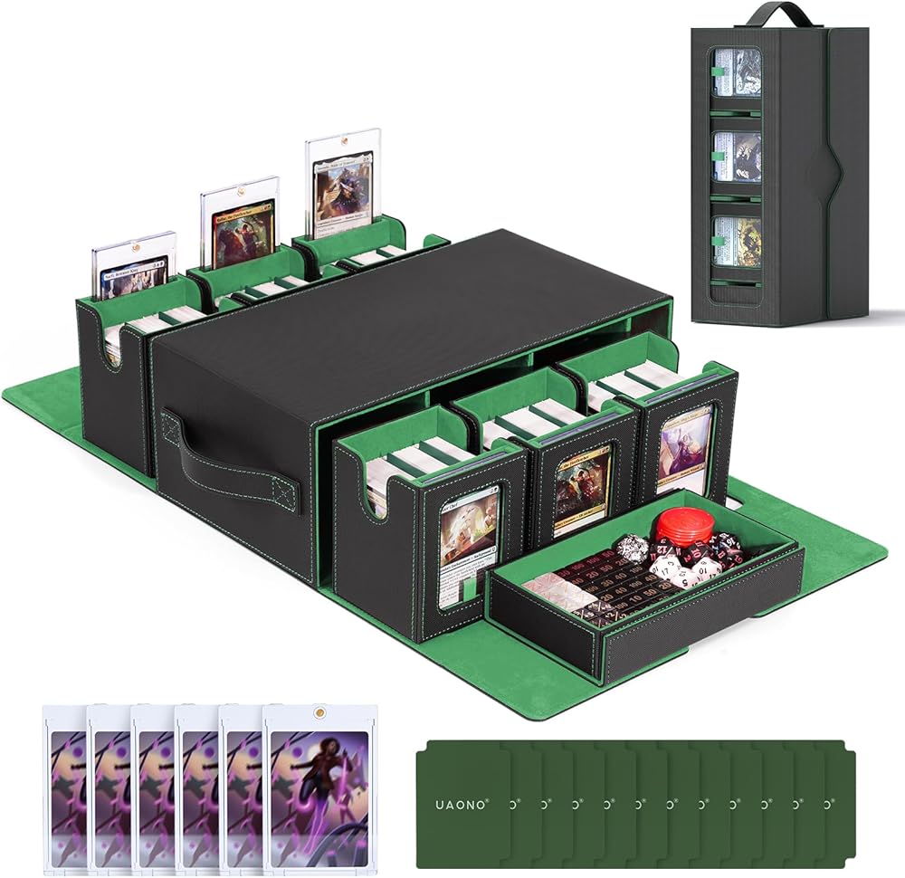 UAONO Commander Deck Box for MTG، حافظة بطاقات معيارية مكونة من 6 طوابق مع علبة نرد تحمل أكثر من 600 بطاقة مزدوجة الأكمام، صندوق تخزين بطاقات التداول قابل للإزالة مع حاملات بطاقات مغناطيسية 35PT لـ TCG، أسود أخضر
