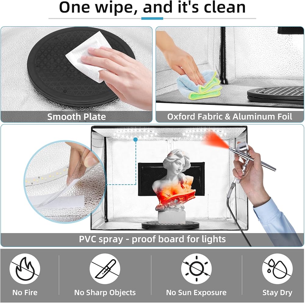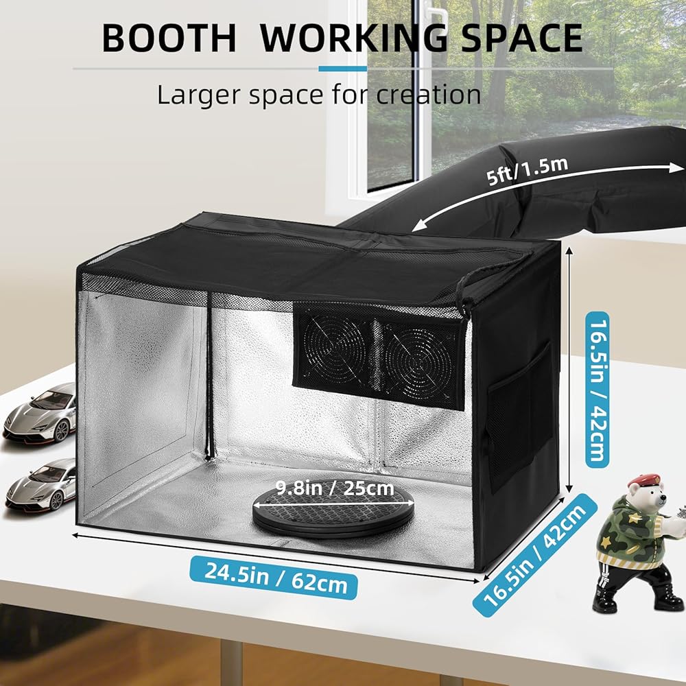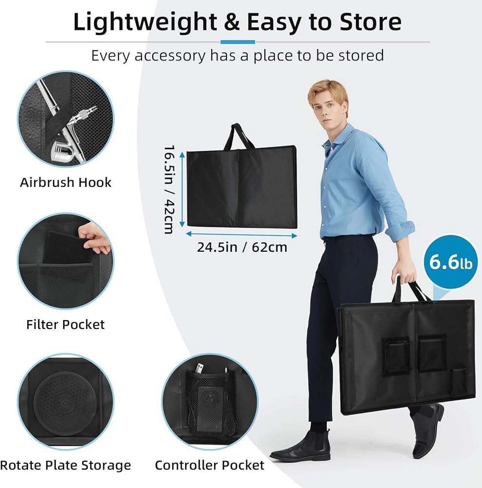 【يوفر كشك رذاذ البخاخة الكبيرة الحجم وخفيفة الوزن منطقة عمل واسعة 24.5 × 16.5 × 16.5 بوصة عندما تتكشف ، مما يوفر مساحة واسعة لك لإطلاق أفكارك الفنية تمامًا. مع وجود جميع الملحقات ، تزن مجموعة Booth القابلة للطي 6.6 رطل فقط ، مما يجعلها محمولة للغاية كمحطة عمل للهاتف المحمول المدمجة