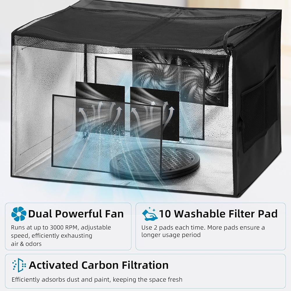【تصميم التهوية والإضاءة المدمجة العملية】 مجموعة كشك البخاخة تأتي مع مراوح قابلة للتعديل سرعة (كحد أقصى 3000 دورة في الدقيقة) ، المصممة لسحب الغبار/الروائح بكفاءة ، و 10 وسادات مرشح الكربون المنشطة القابلة للاستبدال (استخدم 2 في وقت واحد). للاستخدام الخفيف ، يمكن تنظيف وسادات وإعادة استخدامها. يتميز المقصورة بأضواء LED قابلة للتعديل مع 3 أوضاع لدرجة حرارة اللون (بيضاء/محايدة/دافئة) و 10 مستويات سطوع ، مما يوفر إضاءة وافرة