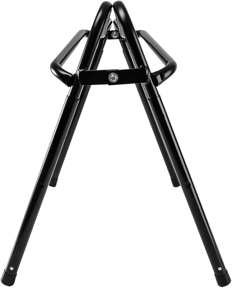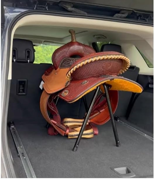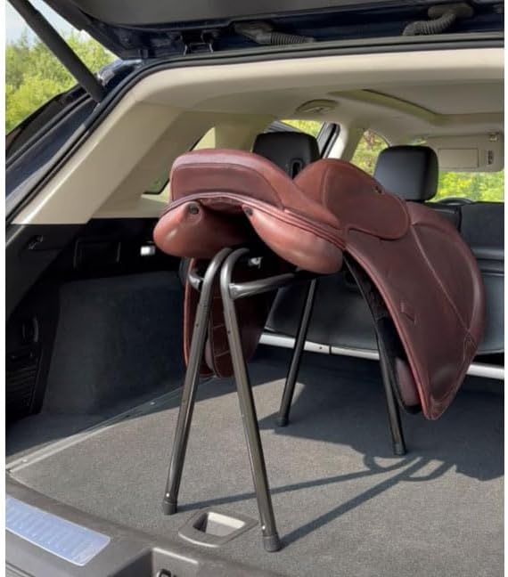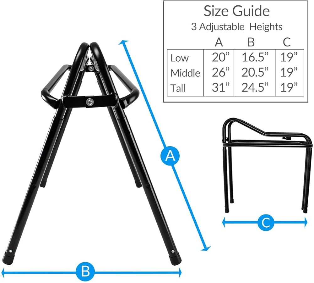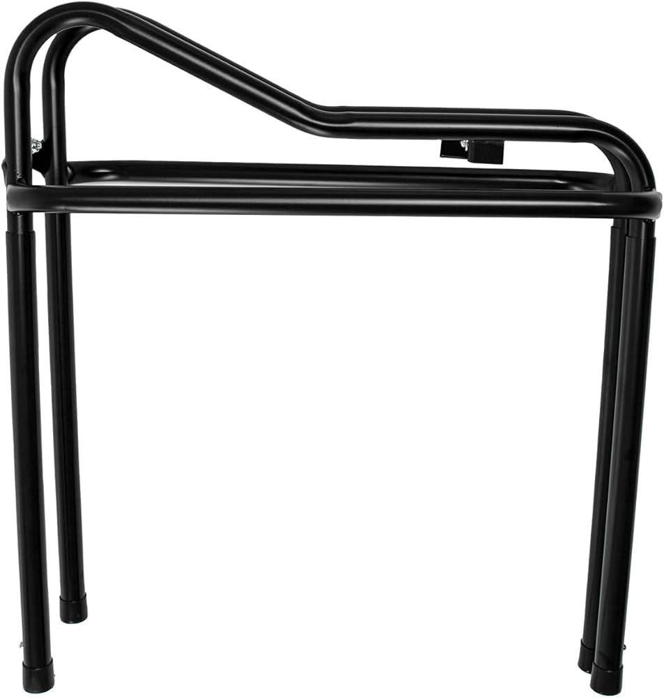 Easily transport your saddle in the back of your car with this Saddle Stand by Country Estates made of smooth black enameled steel. Once you have reached your destination remove and extend the legs of the stand with the easy to use push buttons that allows for height adjustment from 20inches for in car use; all the way up to 32 inches tall for regular use. Saddle stand folds down to save on storage space when not in use.