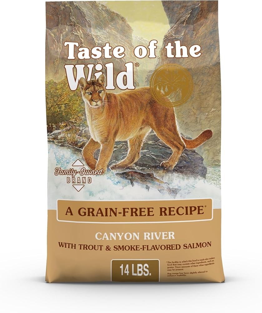 Taste of the Wild Canyon River with TROUT and SMOKE-FLAVORED SALMON dry cat food; high protein content (32%) helps support bones, joints and a LEAN, HEALTHY BODY CONDITION; fish is the only source of animal protein in this recipe, so it may be a good choice for cats with food-related sensitivities