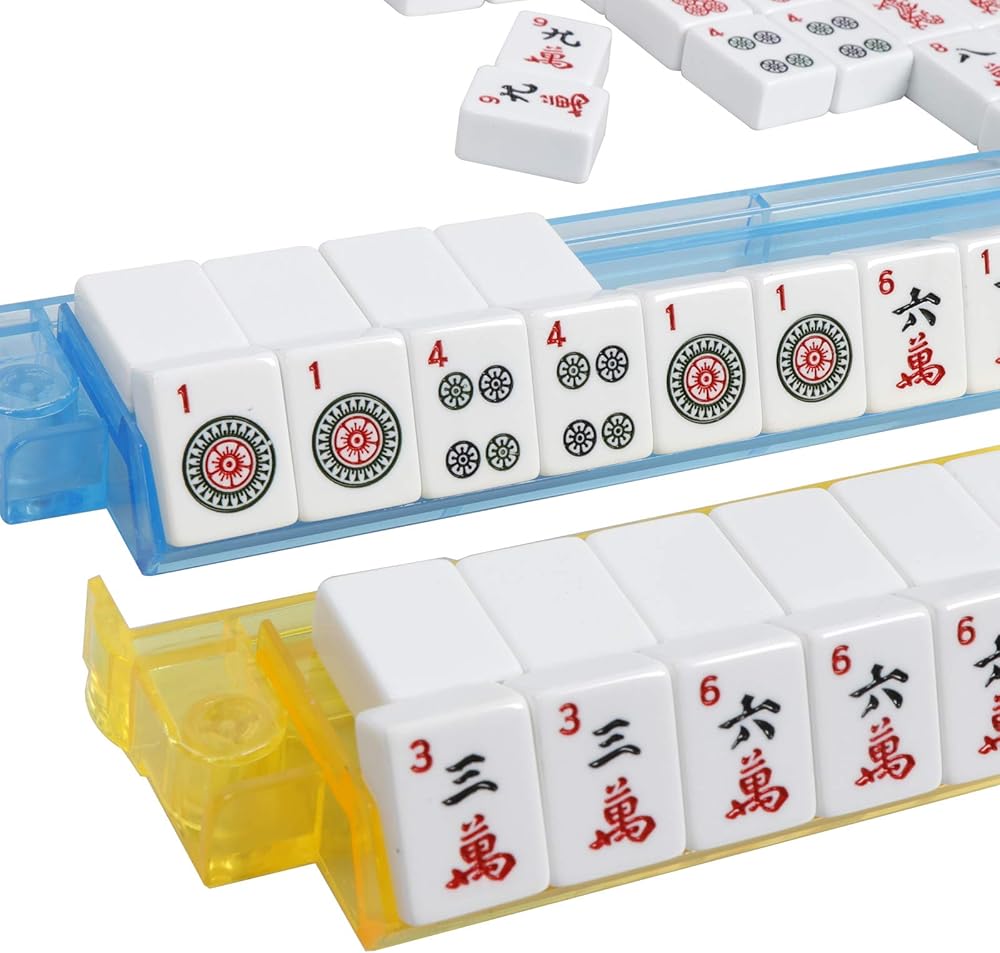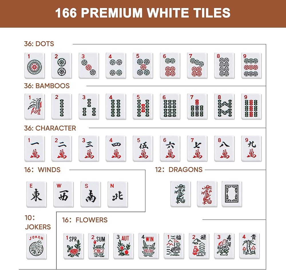 مجموعة Mahjong الكاملة: مجموعة Mahjong أنيقة بشكل مثير للإعجاب تتكون من 36 نقطة ، 36 Bamboos ، 36 حرفًا ، 12 تنانين ، 16 رياحًا ، 16 زهرة ، 10 من المجلات ، 4 بلاط احتياطي فارغ مع 3 زهر كبير , 100 رقائق مالية وتعليمات حول كيفية اللعب. العب كل من Mahjong الأمريكي والصيني ببساطة عن طريق استخدام Dragons Red كـ "هونغ تشونغ" والتنينات الخضراء كبلاط "FA"