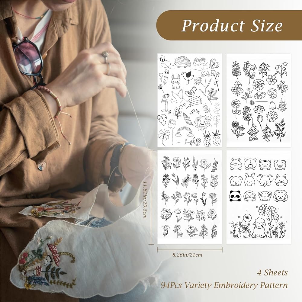 94Pcs Stick and Stitch Embroidery Stencils Water Soluble Embroidery Papers Designs with Pre-Printed Designs Floral Animal Patterns for Easy Stitching Dissolving Hand Sewing Lover Beginners(Pack of 4)